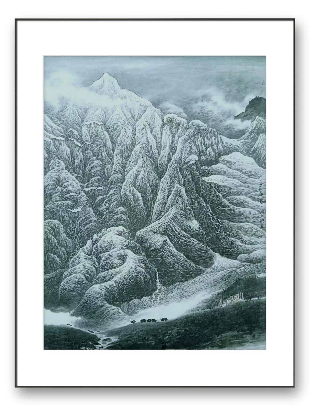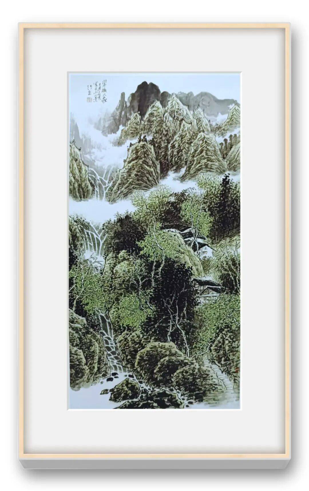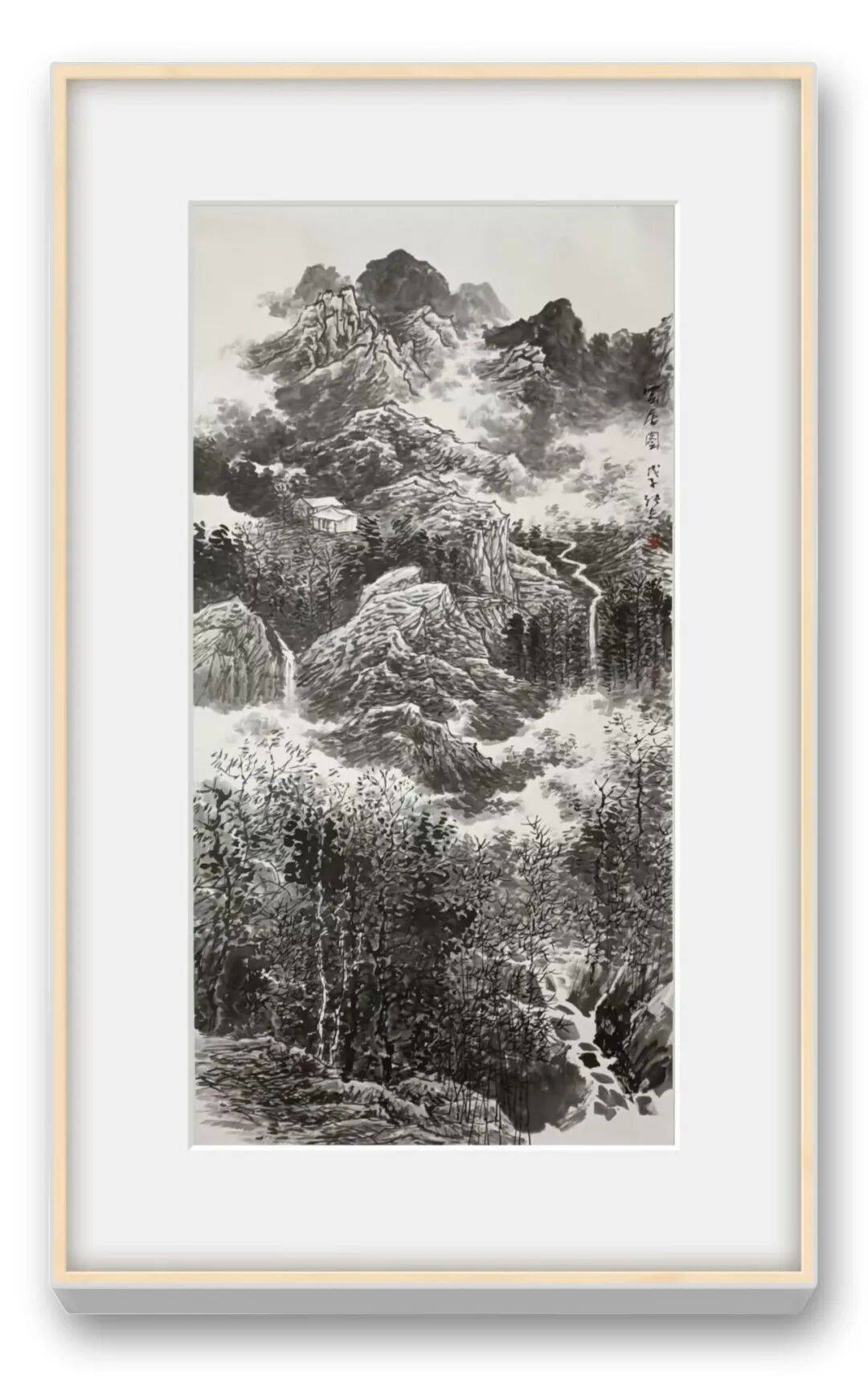 画面中,远山层峦叠嶂,以浓淡相宜的墨色勾勒出山石的肌理与层次,云雾在山间游走,为冷峻的山石添了几分空灵缥缈。近景的林木枝繁叶茂,笔法细腻而不失苍劲,每一根枝桠、每一片树叶都仿佛在诉说着山林的幽寂。掩映在林木间的屋舍,白墙黑瓦,质朴而宁静,恰似隐士于尘世喧嚣中寻得的一方净土。画家以精湛的笔墨技法,将终南山的雄浑与山居的雅致融为一体,让观者仿佛能听见山间的鸟鸣、嗅到草木的清香,更能感受到那份“采菊东篱下,悠然见南山”的闲适与超脱。