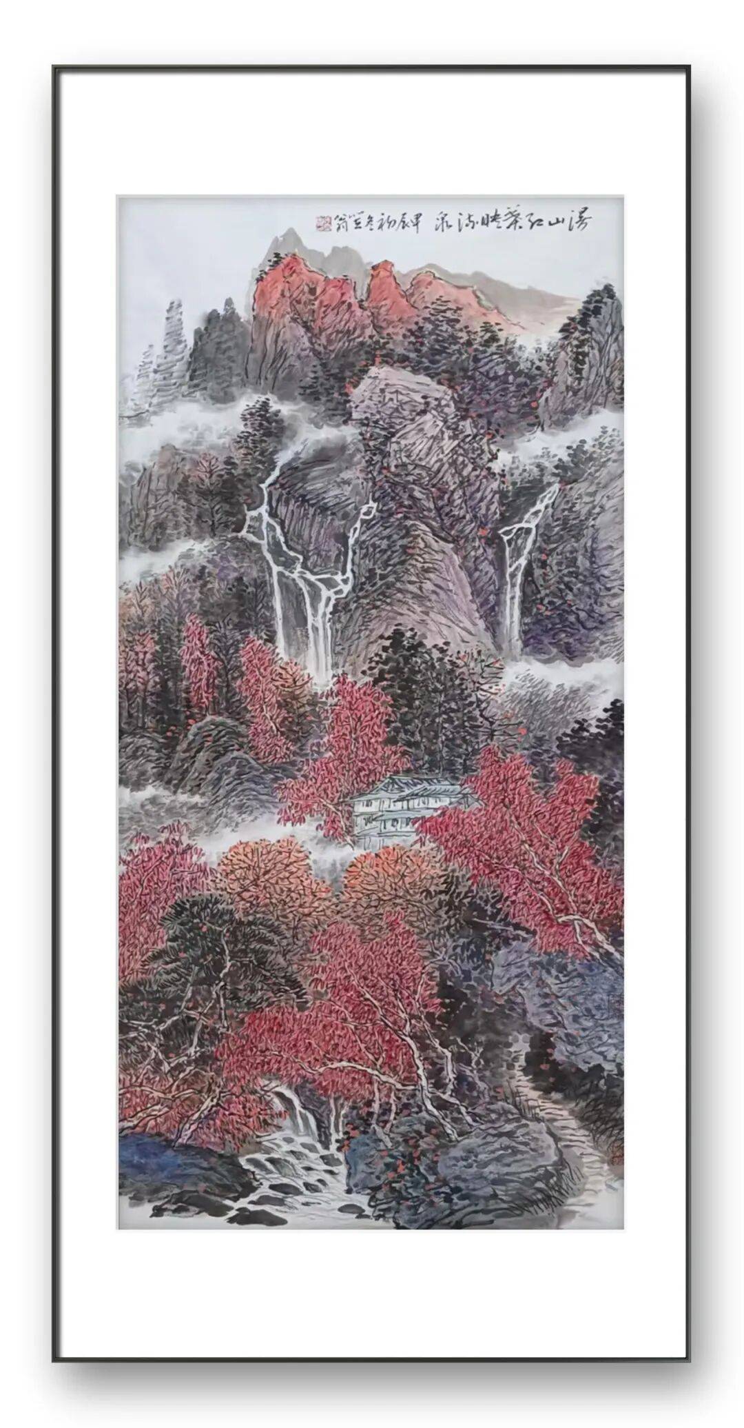 张立先生书画的独特之处,在于他对色彩的大胆运用与创新性探索,这构成了其“大彩写意”的核心特质。他打破了传统水墨“水墨为上”的色彩观念,将丰富的色彩纳入水墨体系,使色彩成为表达情感、营造意境的灵魂元素。在山水画他以大面积的红色渲染林木,与飞瀑流泉的水墨形成强烈对比,既展现出秋日山林的绚烂之美,又通过色彩的冷暖对比增强了画面的空间层次与视觉冲击力。这种对色彩的主观运用,是对传统水墨“随类赋彩”观念的超越,赋予了山水以强烈的现代感。