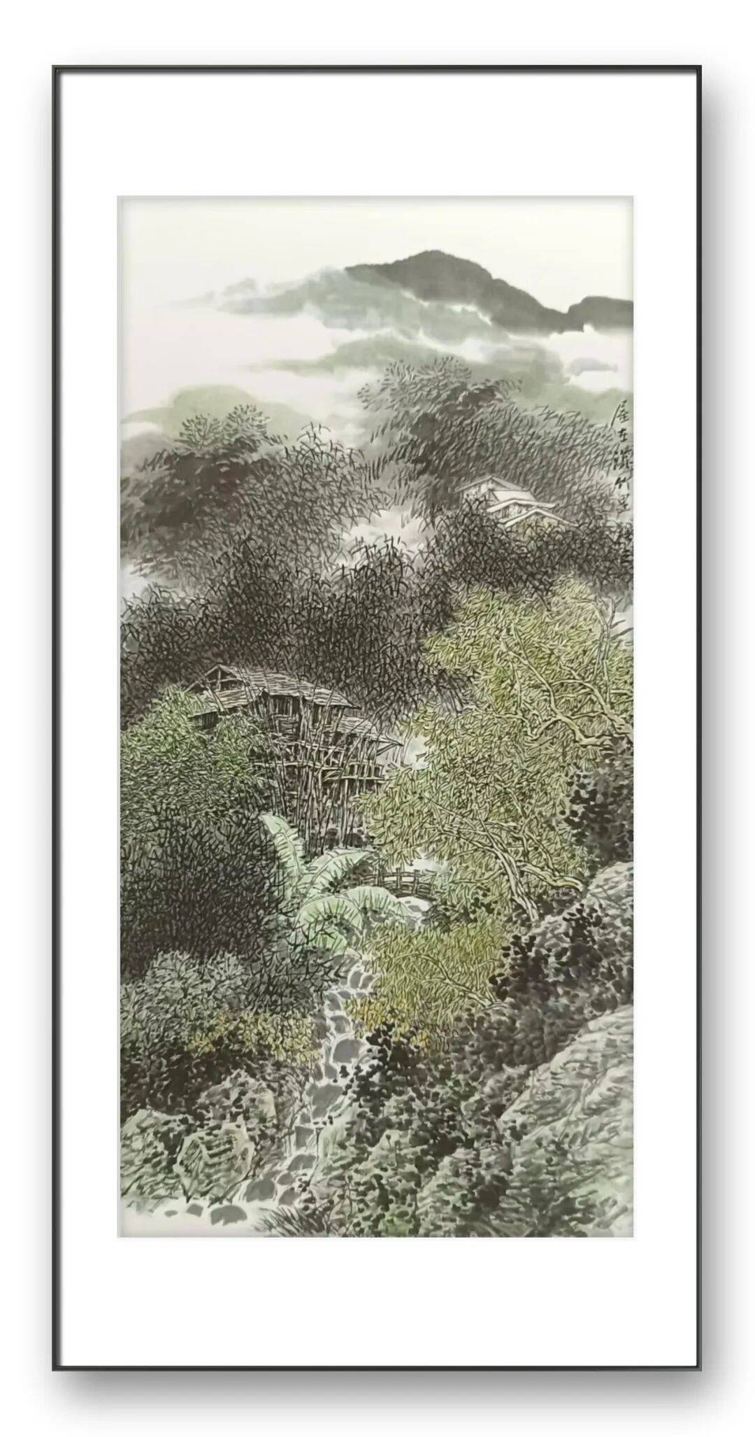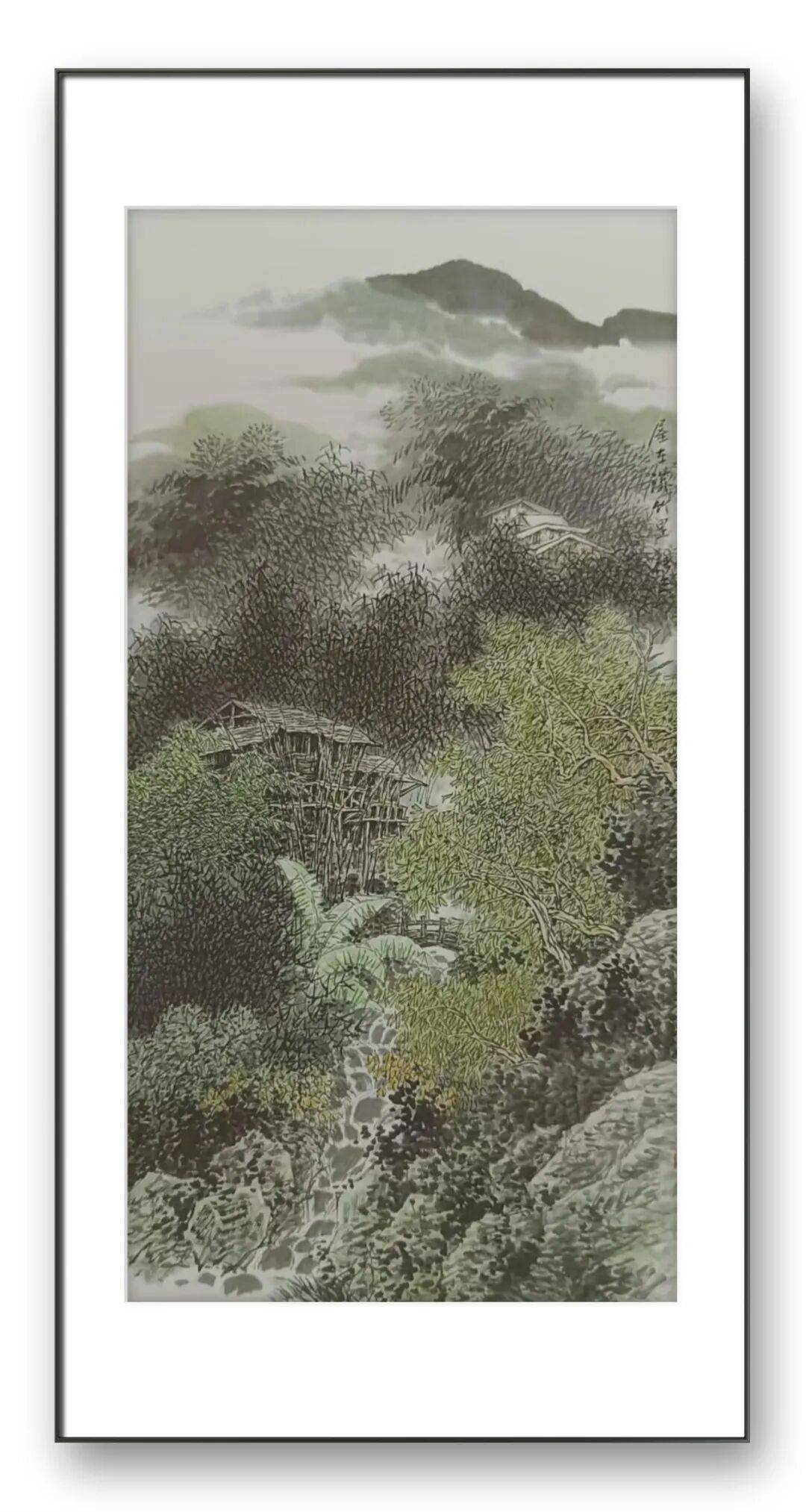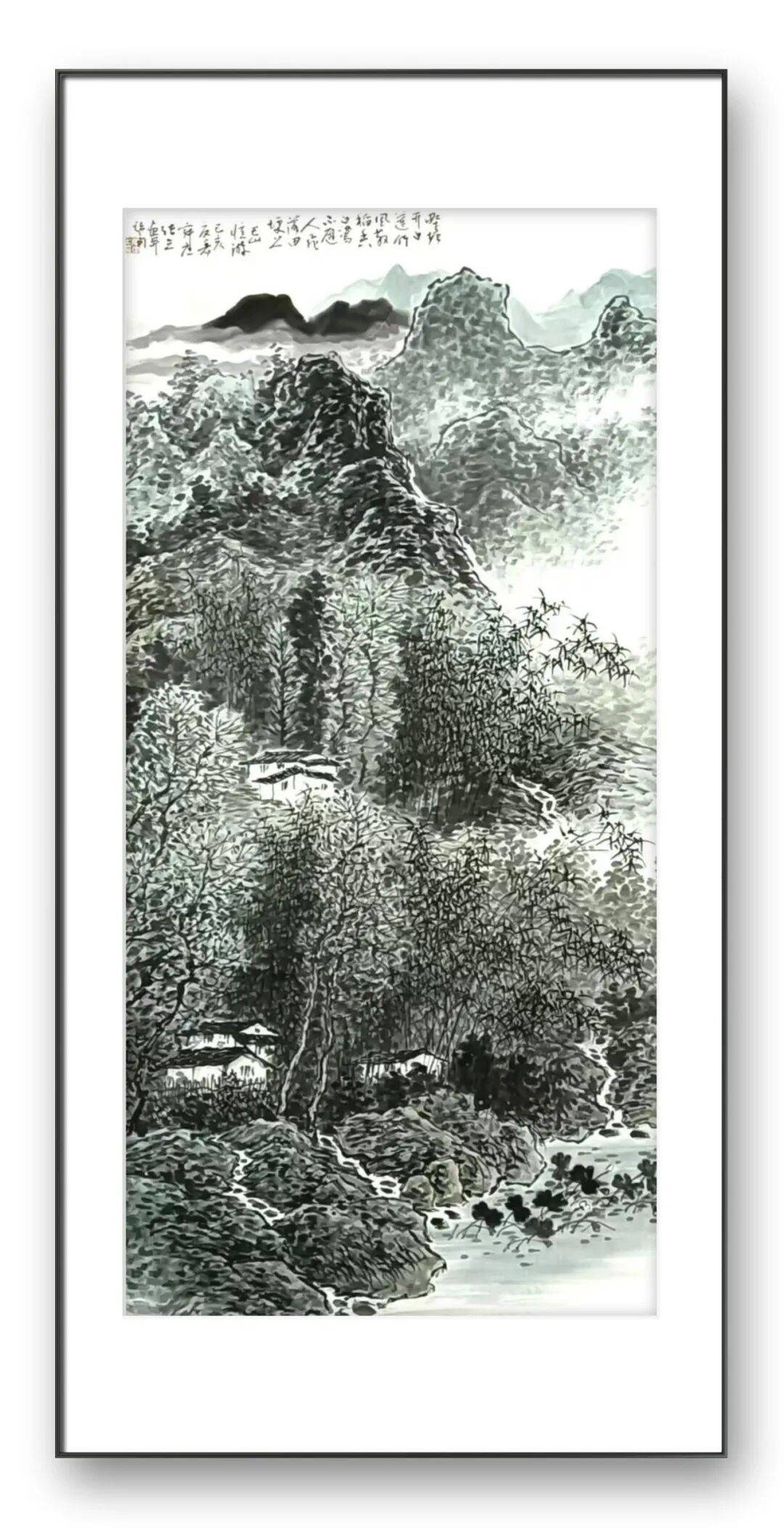 画面的墨色更为温润,充满了江南山水的灵秀之气。竹林的刻画尤为精妙,张立先生以细密的笔触描绘出竹叶的疏密交错,既显竹林的繁茂,又透出林间的通透。屋舍的形制带着浓郁的乡土气息,与周围的自然环境和谐共生,仿佛是从这片山水里自然生长出来的一般。溪流的描绘灵动鲜活,石块的质感与流水的动感形成鲜明对比,让整个画面有了声韵,有了生气。这幅画所营造的,是一种“竹喧归浣女,莲动下渔舟”的田园诗意,是对平淡质朴生活的深情眷恋。