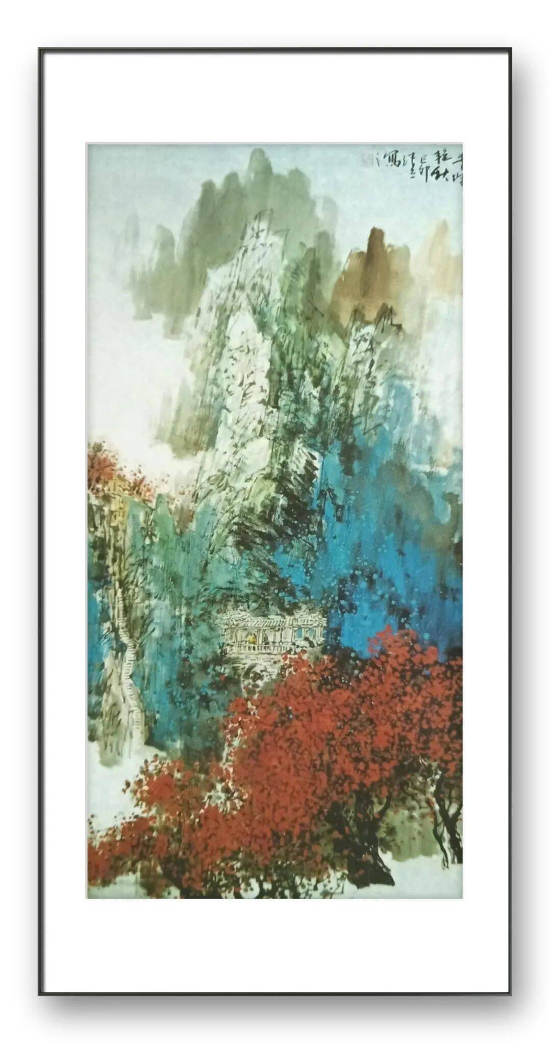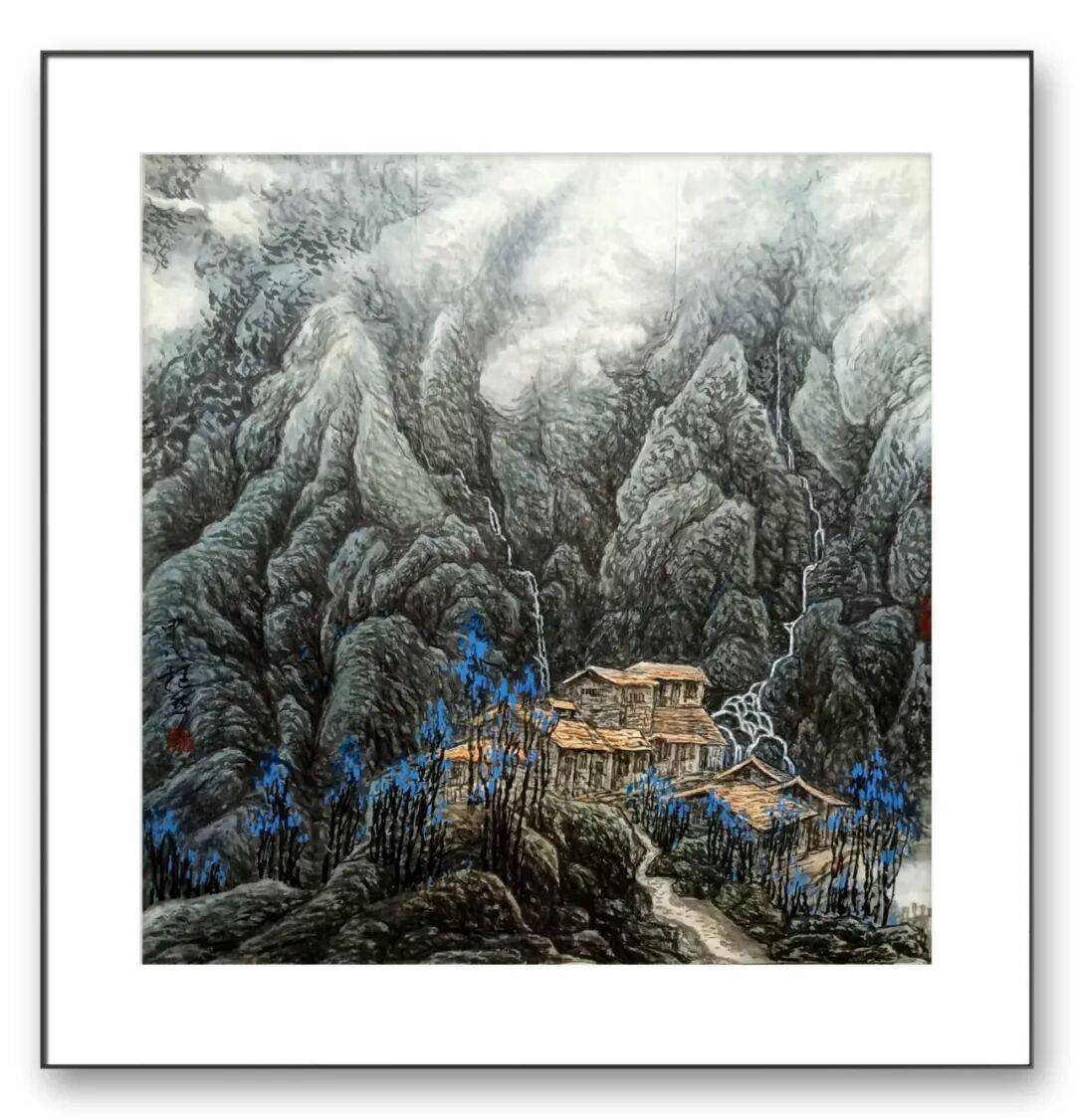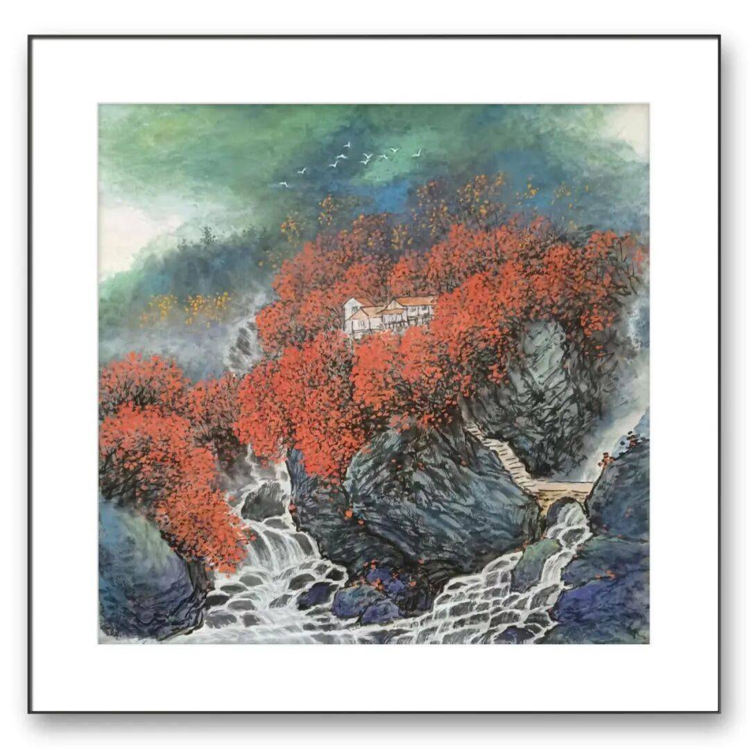 张立先生的彩墨创作,首先打破了传统水墨“重墨轻彩”的固有范式,却始终未脱离“笔墨为骨”的根本。观其代表作苍山云起,画面中山石的勾勒仍沿用“斧劈皴”的传统技法,线条劲挺如刀削,墨色由浓至淡层层晕染,既表现出山石的厚重质感,又营造出云雾缭绕的空灵意境,这是对“外师造化,中得心源”传统理念的坚守。但他并未止步于此:在墨色铺陈的基础上,他以矿物颜料调和现代丙烯,将赭石、石绿、朱砂等色彩以“点染”“泼彩”的方式融入画面,山脚的红叶、山腰的翠松、山顶的残雪,在墨色的衬托下既鲜活明快,又不失沉稳雅致,彻底摆脱了传统彩墨易显“俗艳”的局限,实现了“墨中有彩,彩中藏墨”的和谐统一。