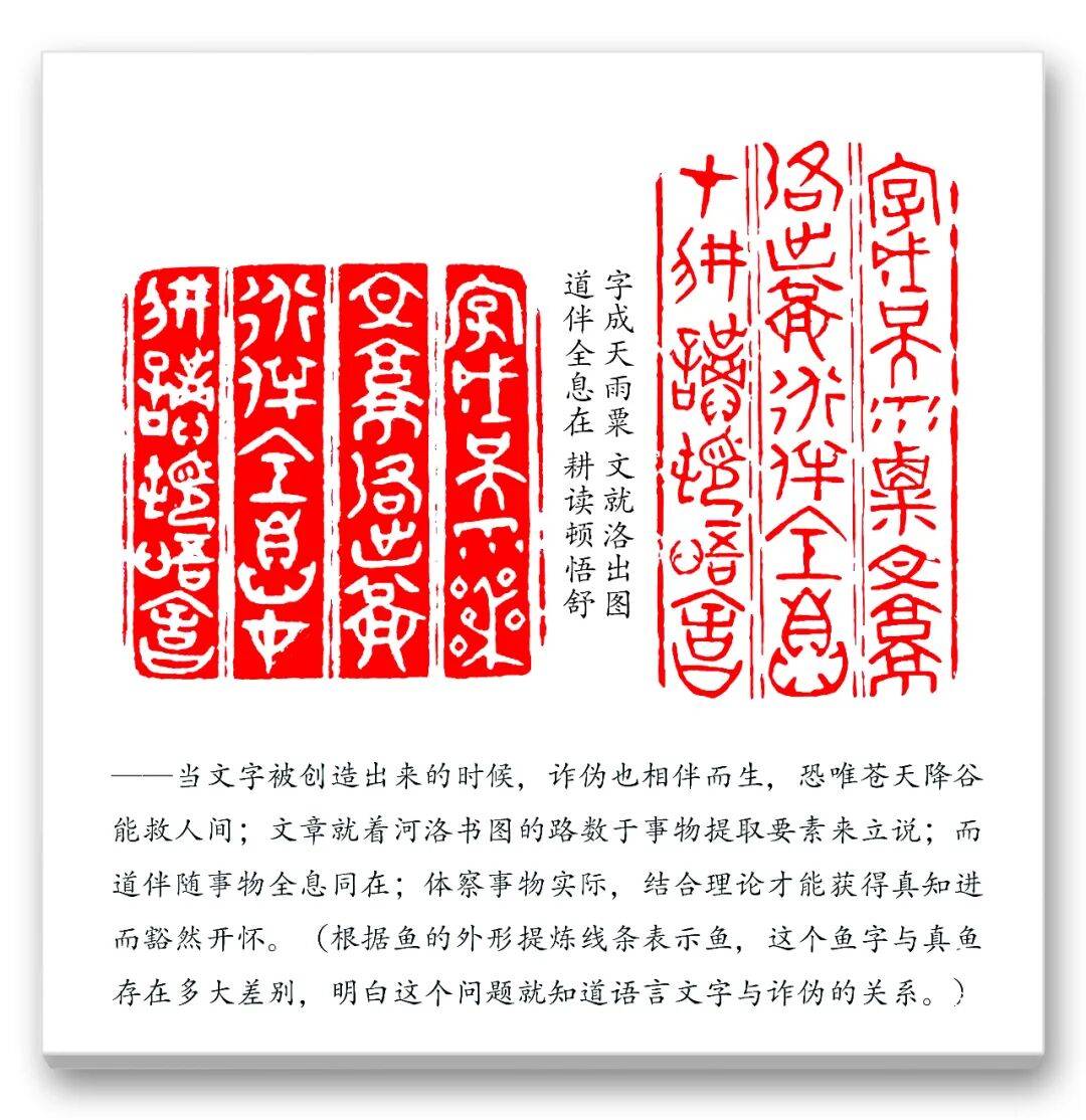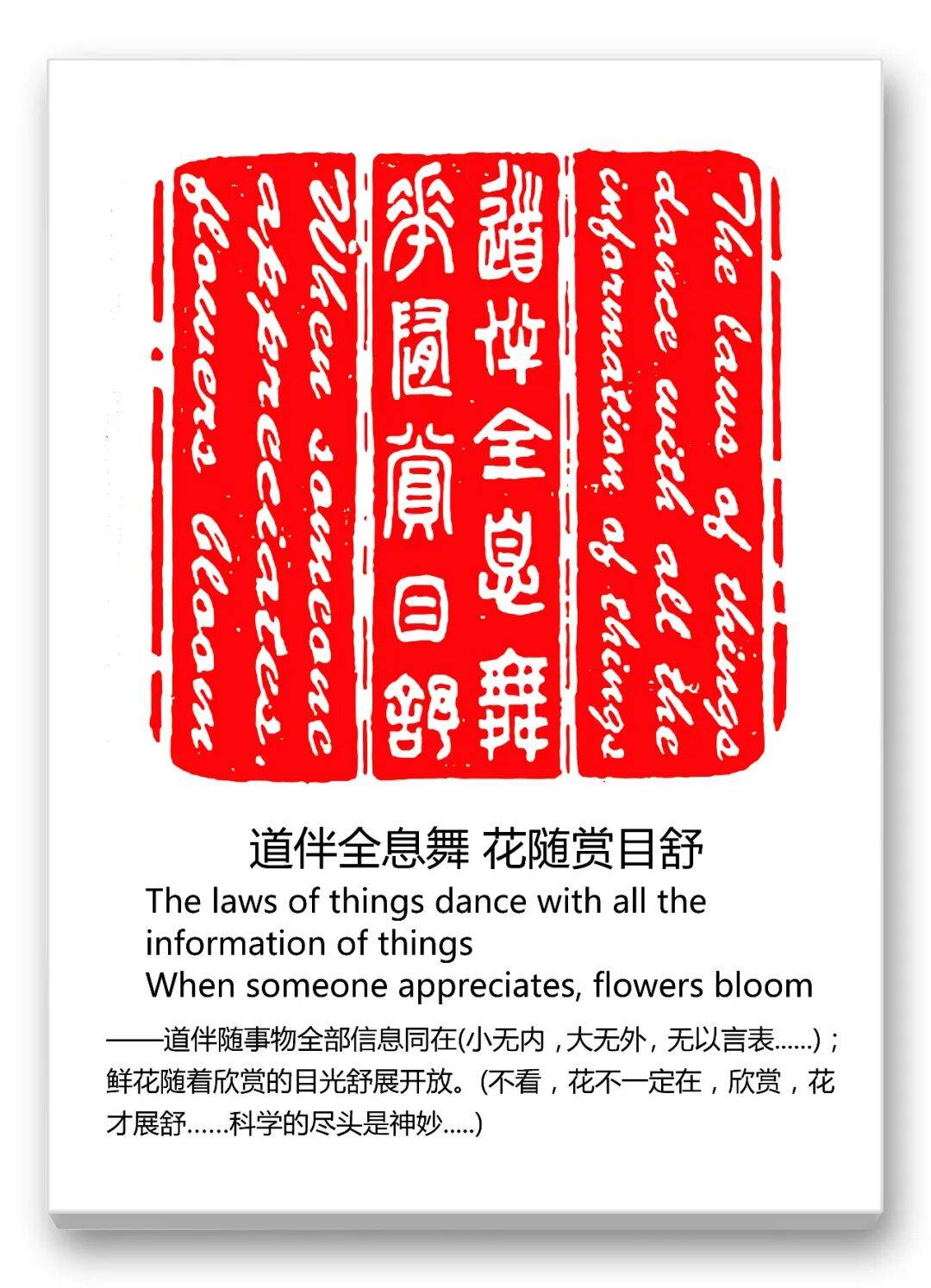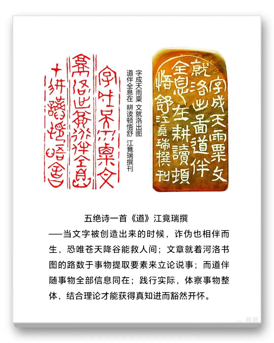 江竟瑞先生的篆刻创作,最具突破性的在于他将哲学思辨与艺术创作深度融合,使篆刻成为阐释“道”与“理”的独特媒介。他的作品中,“全息”“道伴”等哲学概念反复出现,形成了一套个人化的艺术哲学体系。在系列作品中,他以篆刻演绎中国传统哲学的“河图洛书”意象,又注入“全息”这一现代科学概念,完成了传统文化与现代思维的对话。印章的文字布局打破常规,将诗、印、理融为一体,边款的释文既是对印文的注解,更是哲学观点的延伸。这种创作方式,使篆刻超越了“标识”“审美”的功能,成为一种思想的雕刻——他以刀刻石,实则是在镌刻对世界本质、认知方式的思考。