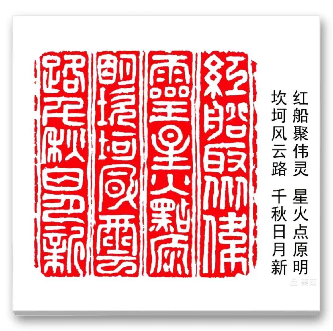章法布局上,他深谙“疏可走马,密不透风”的传统布局智慧,又能因文赋形、因意变法。以多列排布容纳长句,字与字、列与列之间疏密错落,既保证了文字的识读性,又通过线条的粗细、空间的虚实营造出强烈的节奏韵律,将红船精神的厚重与绵长以视觉化的篆刻语言呈现,让传统技法成为承载红色文化的有效载体。这种对传统的承续,并非简单的“复古”,而是在理解传统精神内核后的创造性传承,使篆刻这一古老艺术形式在当代仍具鲜活的生命力。