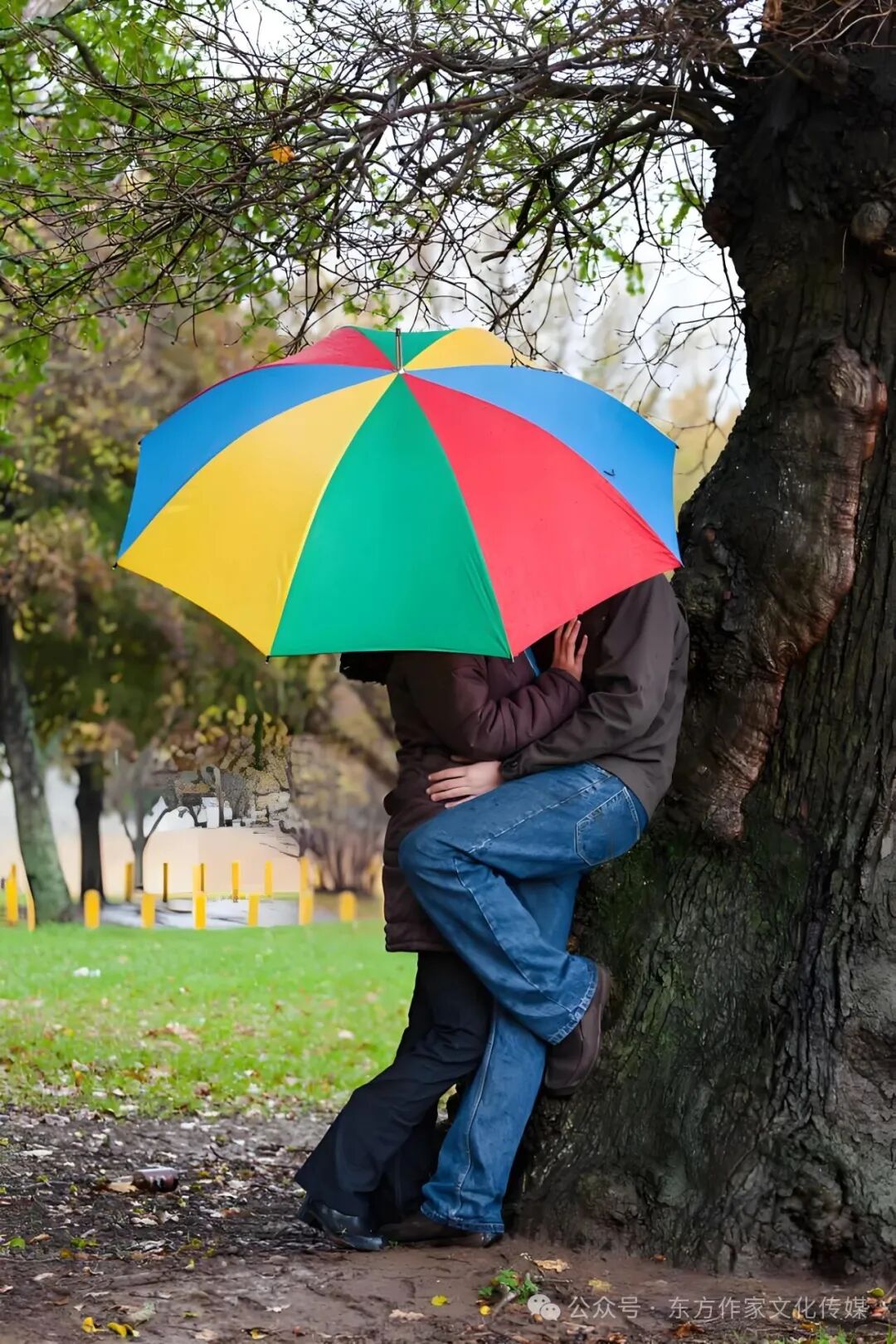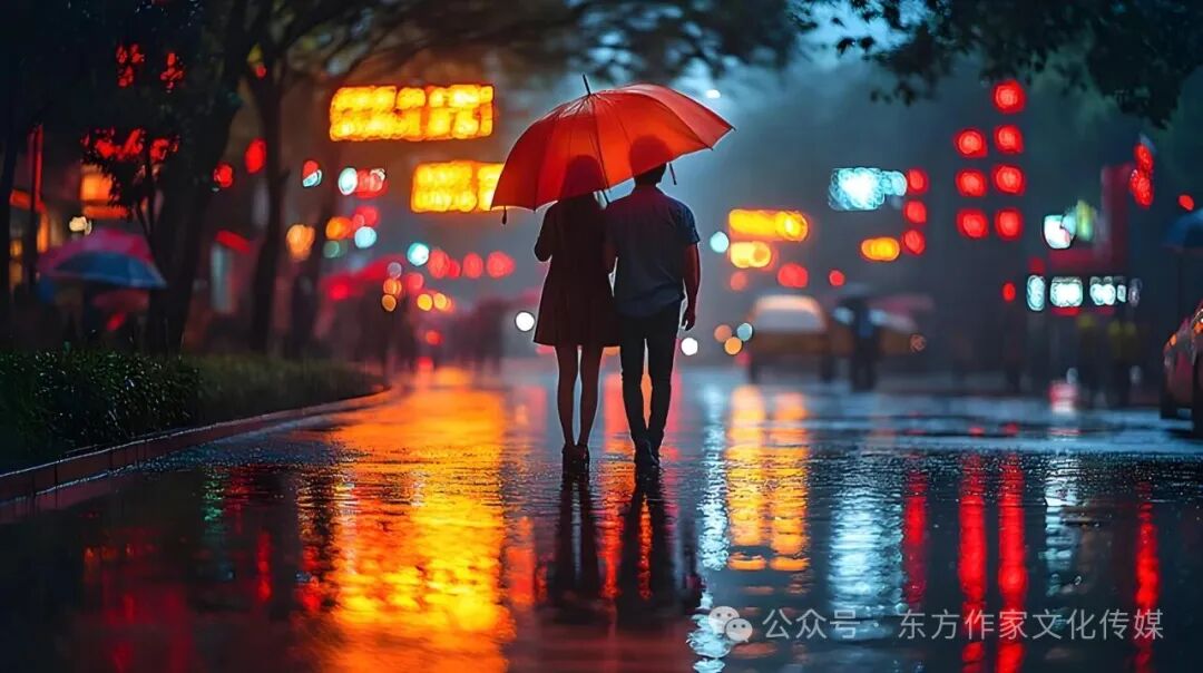 随后,诗人以拟人化赋予“伞”生命,使其成为情感“旁观者”:“仅剩下伞,涨红了脸,眯着眼睛,一切陌生。它哪里知道——人世尚有真相爱,秋天约会伞下情。”“涨红了脸”既暗合秋日伞的视觉特征,又似伞因见证真情而羞涩;“眯着眼睛”的懵懂与“人世有真爱”的感慨形成对比,从侧面凸显伞下爱情的珍贵,增添诗歌趣味的同时,让情感表达更含蓄深刻。