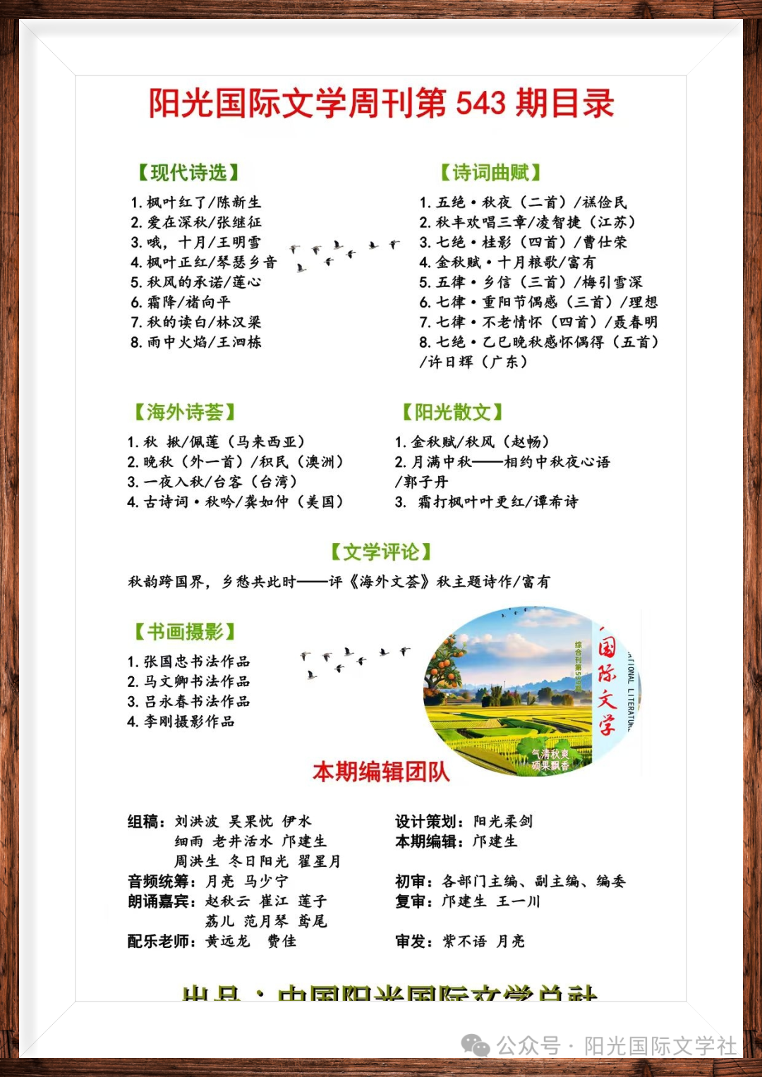 三位诗人虽身处不同国度,笔下秋景亦有差异,却都以“秋”为媒,传递出共通的情感——对故乡的眷恋、对岁月的感悟。佩莲的柔情、积民的苍茫、龚如仲的雅致,风格各异却意韵相通,让《海外文荟》543期的秋主题诗作,成为一场跨越国界的“秋之共鸣”。在这些诗句里,秋不再只是季节的符号,更是承载乡愁与人生思考的载体,让读者在品味秋韵的同时,也感受到海外游子心底那份从未褪色的家国情怀。