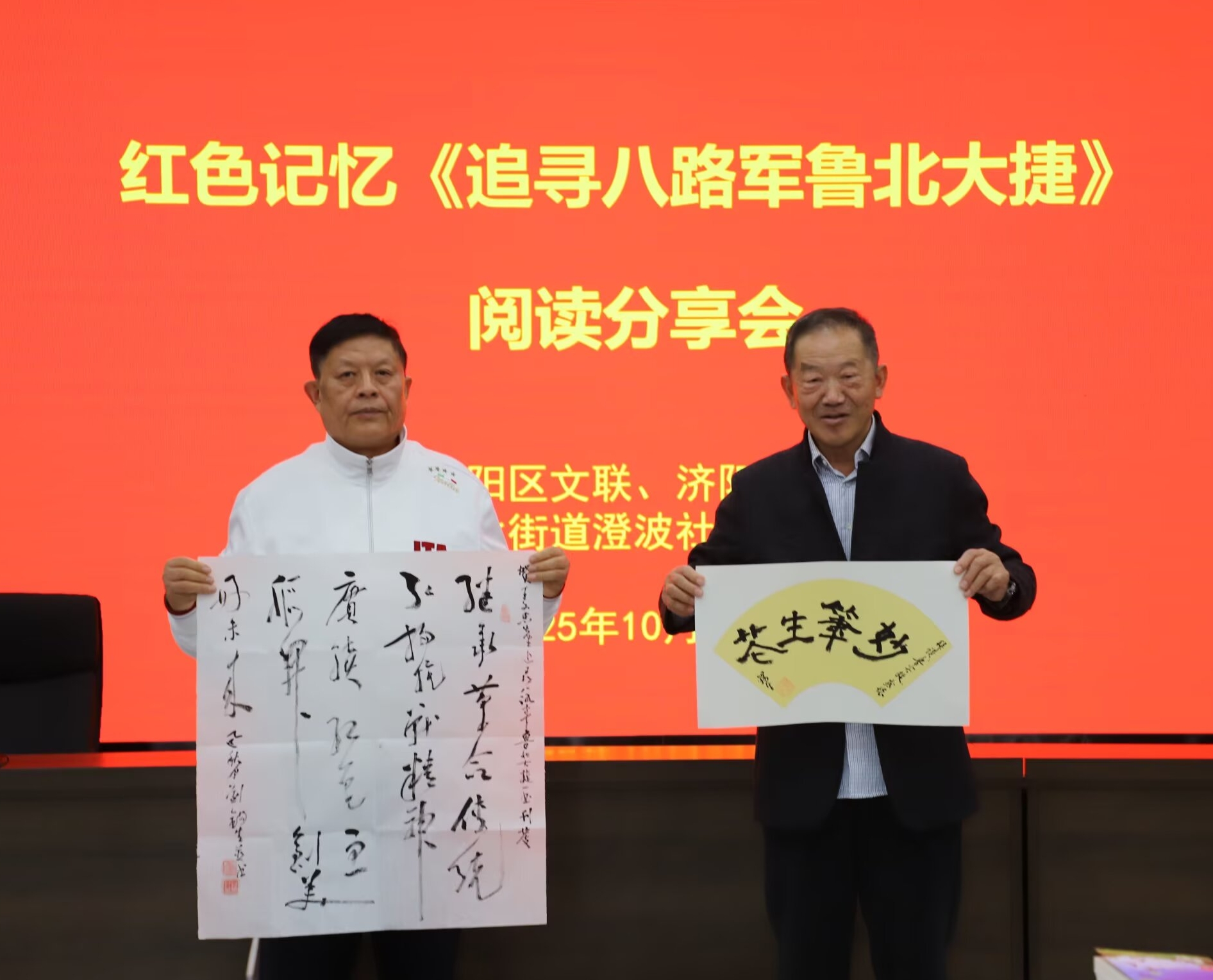 (10月24日上午,济南市济阳区作家协会在济北街道澄波社区三楼会议室召开“红色记忆《追寻八路军鲁北大捷》阅读分享会”。作者王天书作了情感触碰与编辑过程简介,济阳区作家协会会员刘锡生激情发言,作了精彩的分享,并创作书法作品赠予王天书同志。)