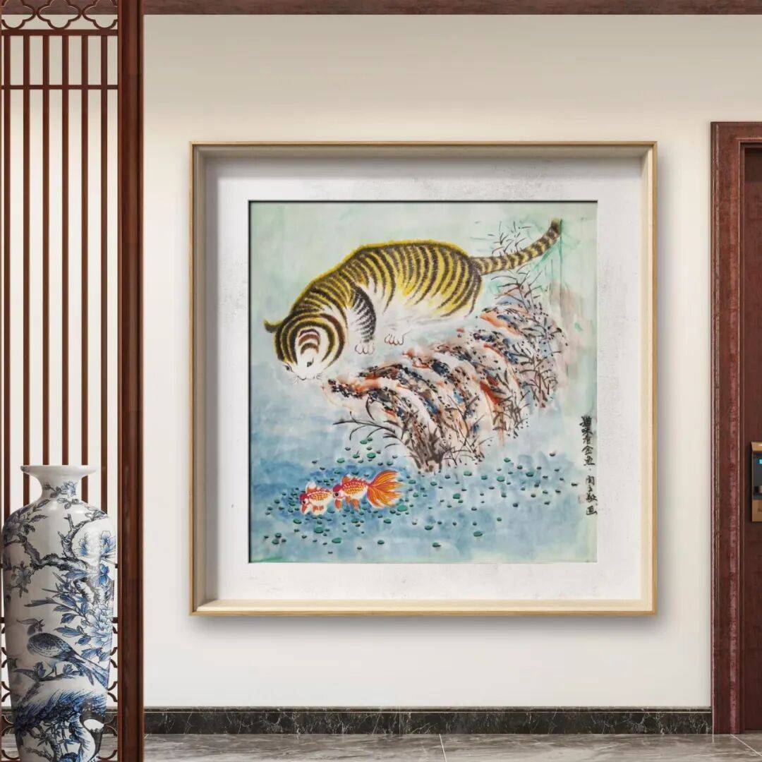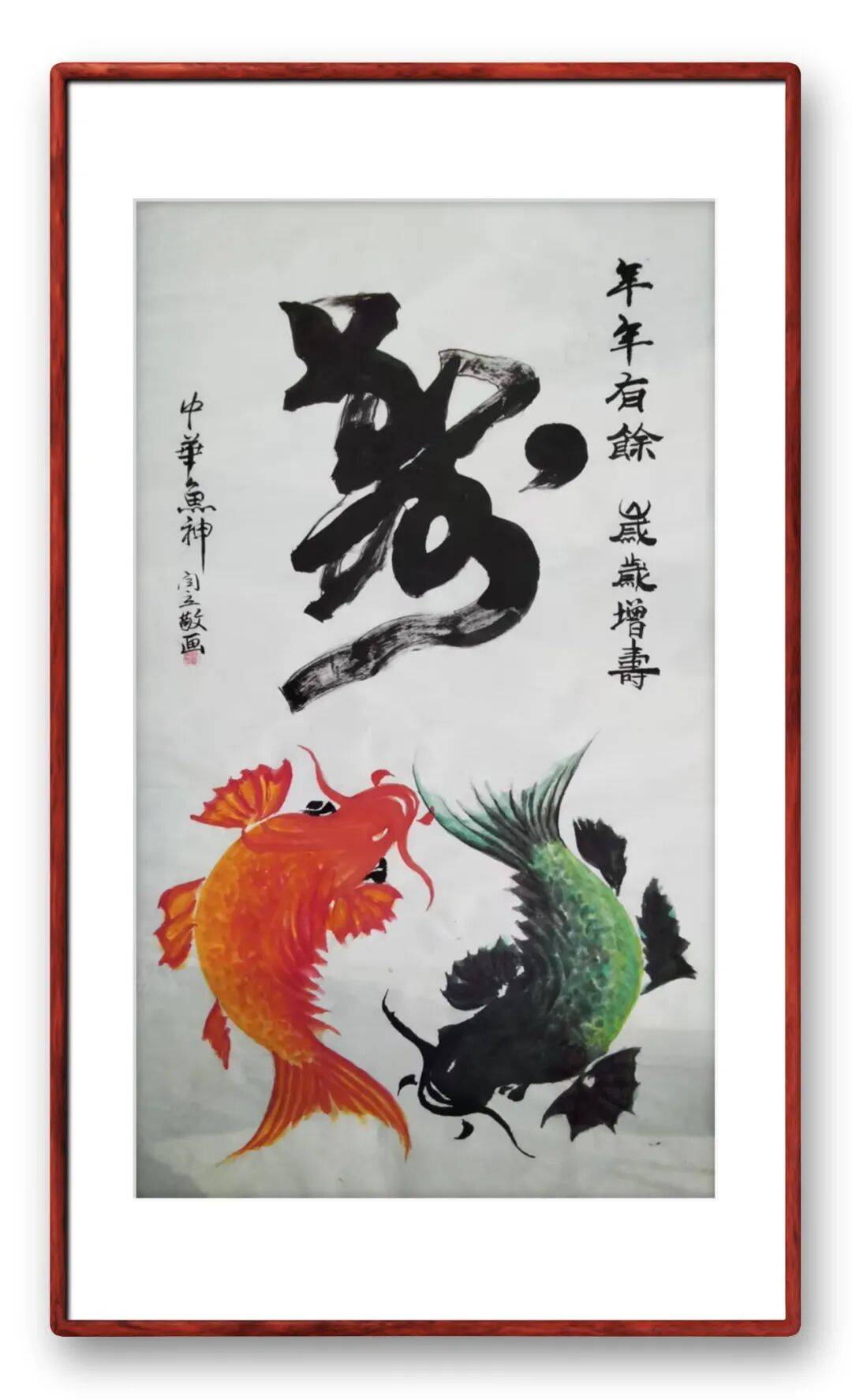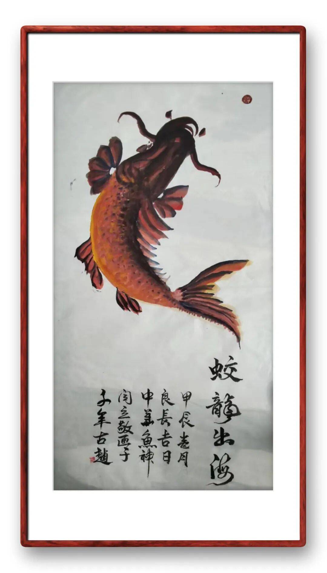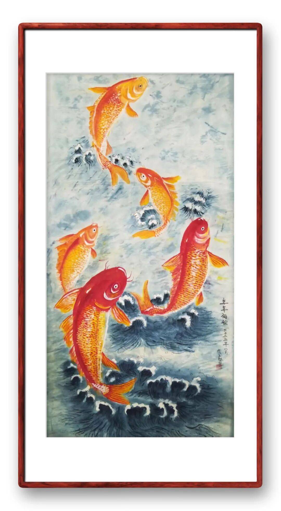 色彩运用上,闫立敬老师也突破了传统水墨的单一性,作品中,红、紫、金、绿等艳丽色彩的融入,让鱼龙形象更具视觉冲击力。笔法精炼,色彩浓烈,于简洁中见精神,将“鸿运”的主题表现得淋漓尽致,适合于书房、客厅等小空间悬挂,尽显雅致意趣。而长卷作品则气势恢宏,数尾鱼龙在长卷中或聚或散、或游或跃,墨色与色彩交相辉映,营造出波澜壮阔的视觉效果,仿佛一幅鱼龙的生命长卷在观者眼前徐徐展开,尽显大家气象。
