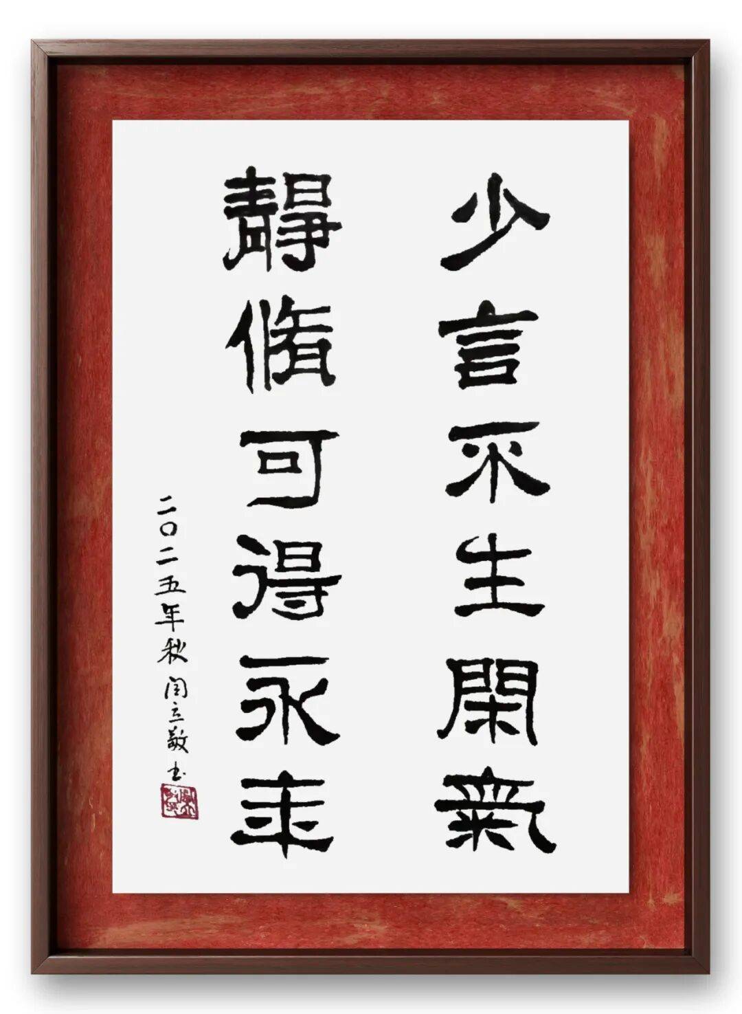闫立敬老师的书法堪称传统笔墨与人格修养交融的典范。其艺术根基深植经典,数十年临池不辍,篆、隶、行、草、魏碑诸体皆能涉猎,尤擅楷书与行草,实现了 “师古而入,法古而出” 的境界。楷书是其标志性擅长,笔画悬空而落,字字传神,兼具古朴俊秀与清新隽逸之态,被各界广为收藏。行草则行云流水,神采飞扬,于笔墨流转中见筋骨力道,尽显碑帖兼容的深厚功力。更可贵者,其书如人。闫老师以 “人品不正,学书无用” 为信条,笔墨间沉淀着淡泊名利的襟怀。书法于他既是精神支柱,亦是传承载体。