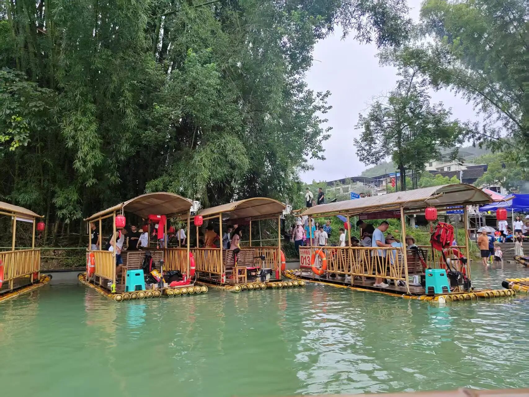 景区内早已熙熙攘攘:小食摊、茶坊、咖啡馆沿街排列,村民们吆喝着招揽划船游客,临水的榕树下游客在荡秋千,竹筏在河面来来往往,一派繁忙景象。