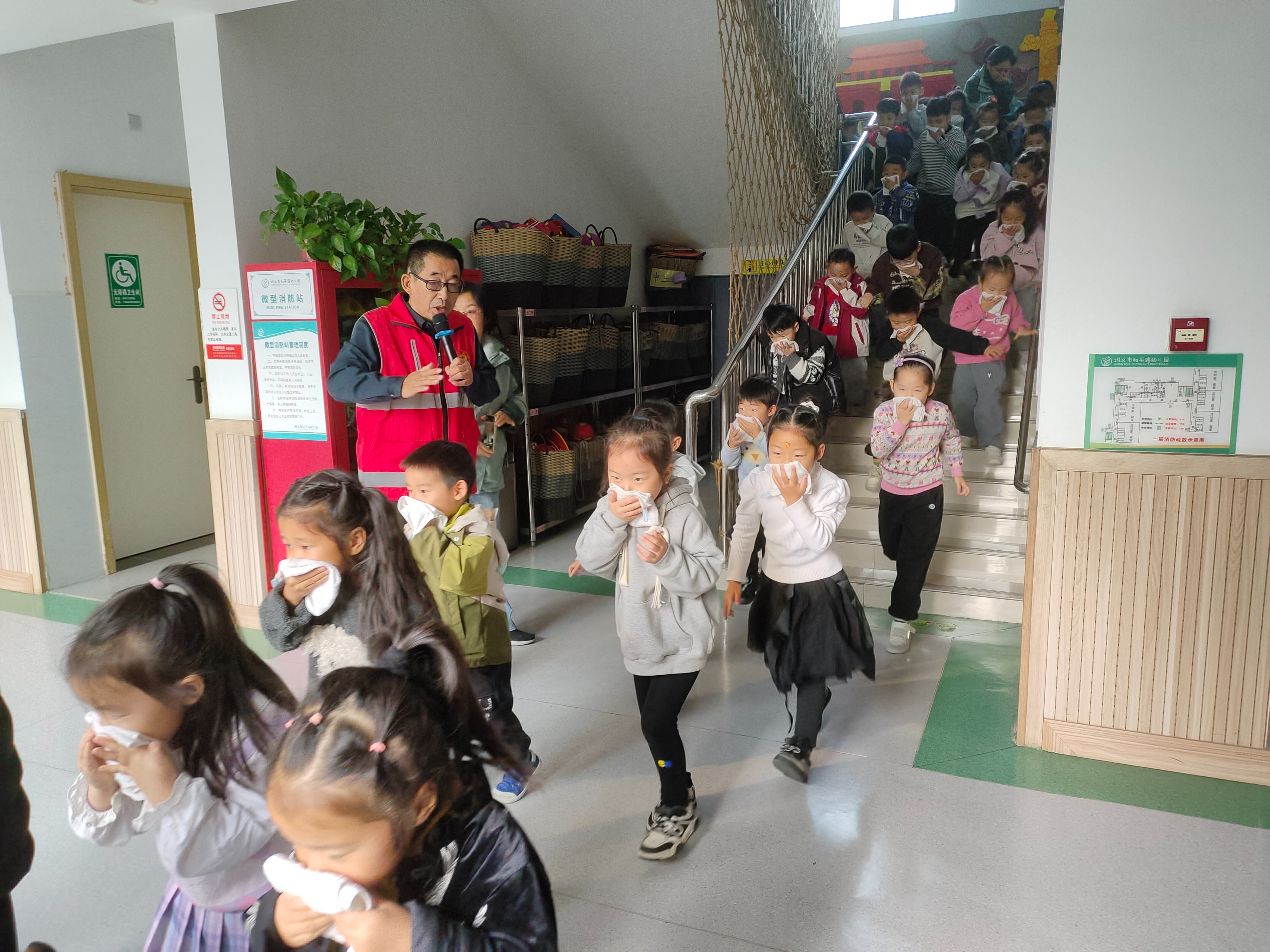 随着急促的火灾警报声在幼儿园里响起,模拟火灾警报声响起,消防演练正式启动。老师们迅速引导幼儿用湿毛巾捂口鼻,弯腰低姿沿疏散通道有序撤离。社区工作人员与路桂林老师在关键节点值守疏导,全体师幼仅用数分钟便安全抵达指定区域,各班老师快速清点人数,演练规范高效,检验了应急预案的可行性。