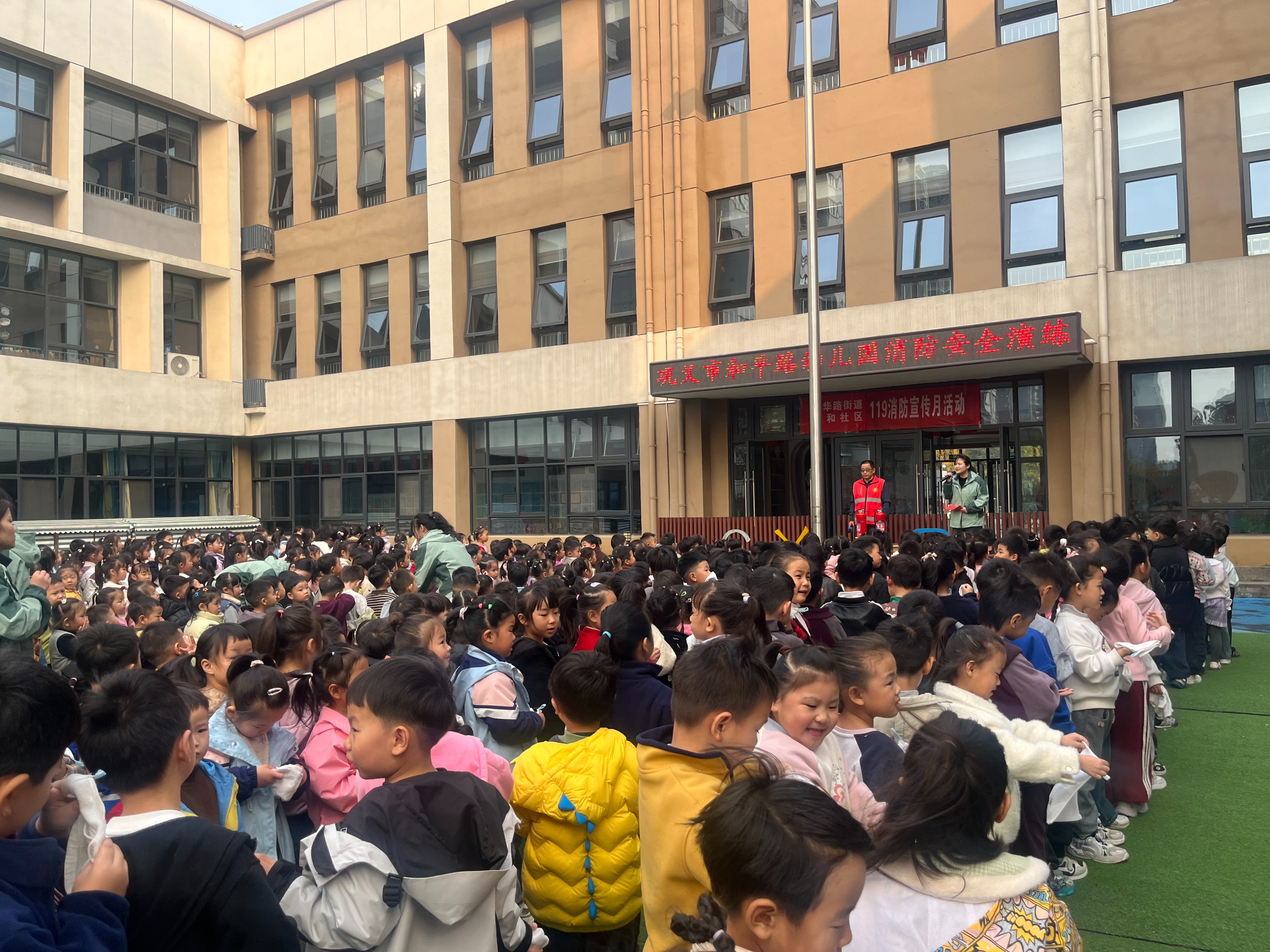 为切实筑牢校园安全防线,强化幼儿园师生消防安全应急能力,在“119”全国消防日来临之际,巩义市新华路街道桐和社区联合街道安监办路桂林老师走进辖区和平路幼儿园,开展以“119全民消防 安全至上——安全用火用电”为主题的消防安全演练,并同步开展“一盔一带”道路交通安全宣传活动,为全体师幼开展一堂全方位、沉浸式的安全防护教育课。
