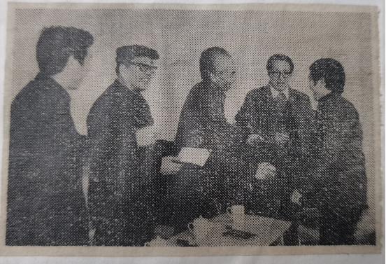 图为1985年3月4日,任孚先(左二)在莱钢文联组织的文学创作座谈会上为《莱钢报》“钢花”文学副刊获奖作者颁奖。