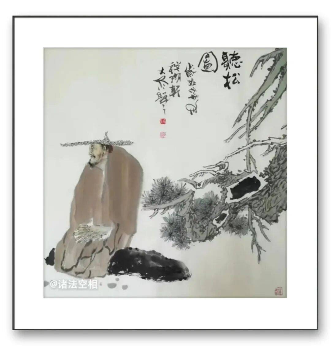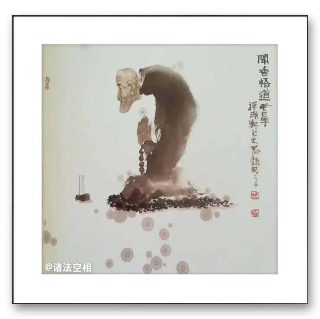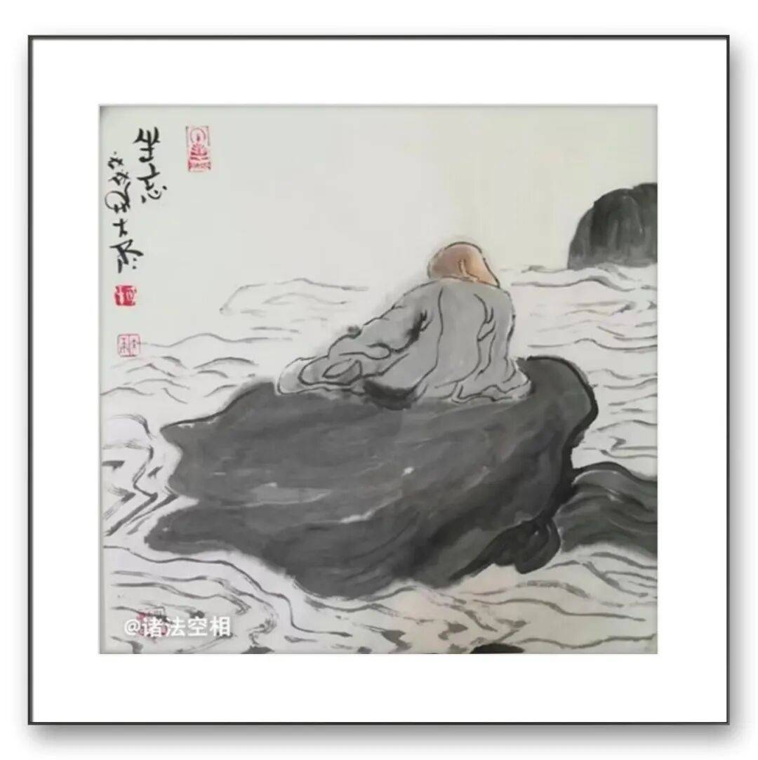 观其罗汉图,或盘膝静坐、神态安详,或袒胸露腹、笑意盈盈,线条简练却精准传神,墨色温润而富有质感。那些褶皱的衣纹、微蹙的眉宇、合十的双手,不仅是对人物形态的细致描摹,更暗藏着对 “禅” 的理解 —— 罗汉的沉静与超脱,正是他对内心澄澈的追求。而达摩造像则更显苍劲雄浑,达摩面壁的坚毅、渡江的从容,在他的笔墨下被刻画得入木三分。粗粝的线条模拟着岁月的痕迹,浓墨重彩间透着一股 “破壁而出” 的力量,这既是对达摩精神的致敬,也是他对坚守艺术初心的自我写照。