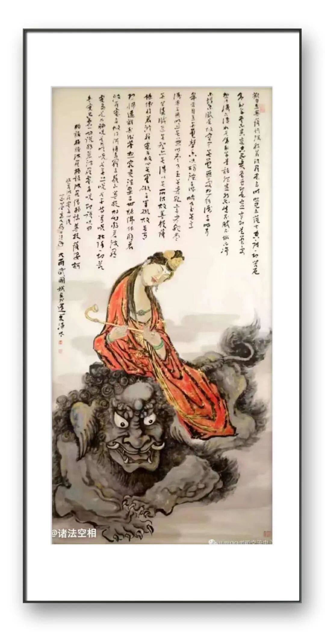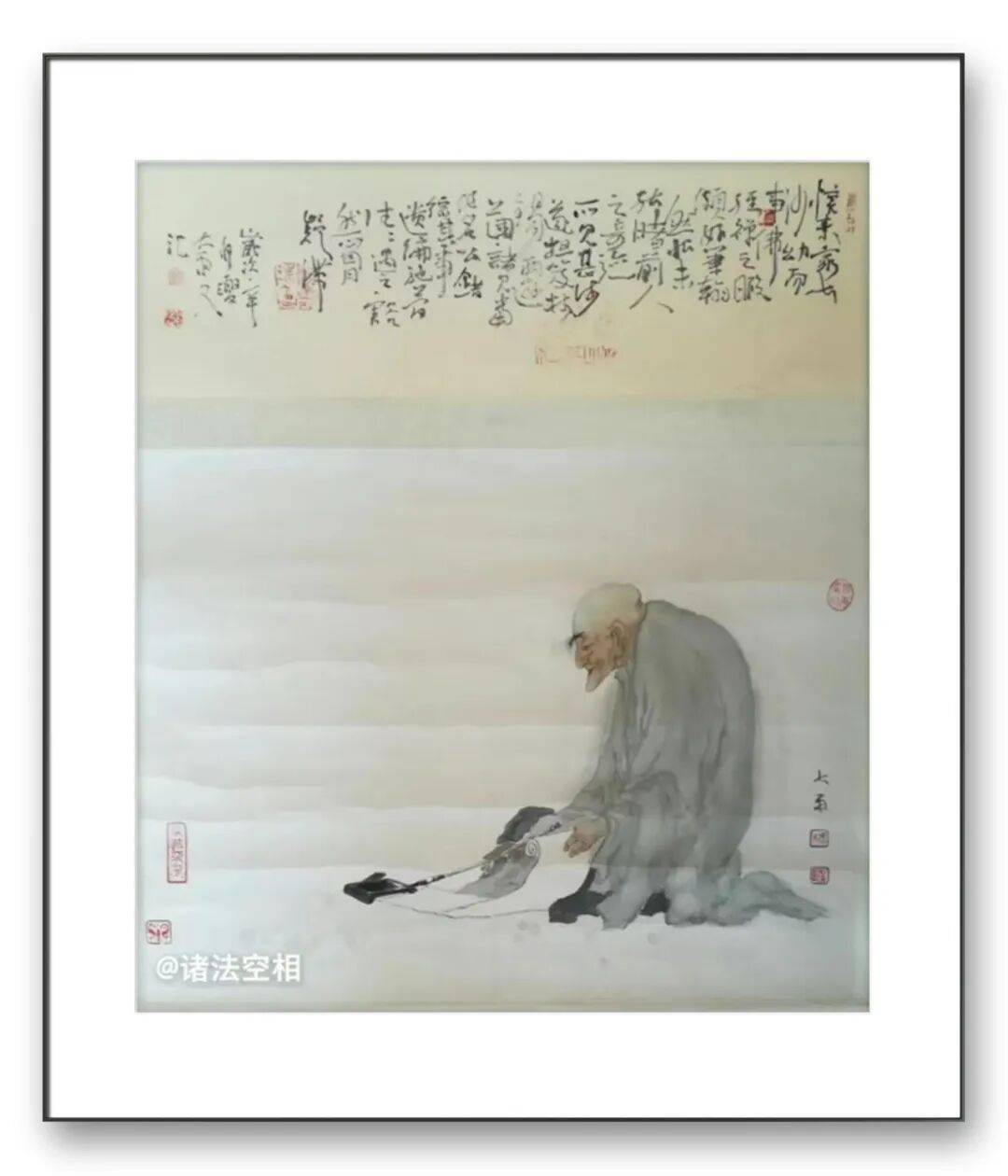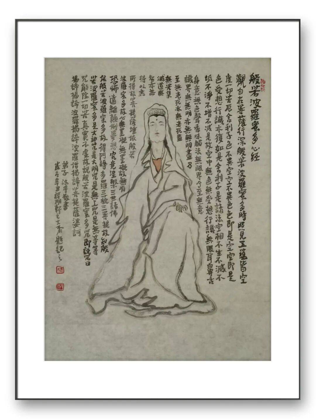 观其罗汉图,或盘膝静坐、神态安详,或袒胸露腹、笑意盈盈,线条简练却精准传神,墨色温润而富有质感。那些褶皱的衣纹、微蹙的眉宇、合十的双手,不仅是对人物形态的细致描摹,更暗藏着对 “禅” 的理解 —— 罗汉的沉静与超脱,正是他对内心澄澈的追求。而达摩造像则更显苍劲雄浑,达摩面壁的坚毅、渡江的从容,在他的笔墨下被刻画得入木三分。粗粝的线条模拟着岁月的痕迹,浓墨重彩间透着一股 “破壁而出” 的力量,这既是对达摩精神的致敬,也是他对坚守艺术初心的自我写照。