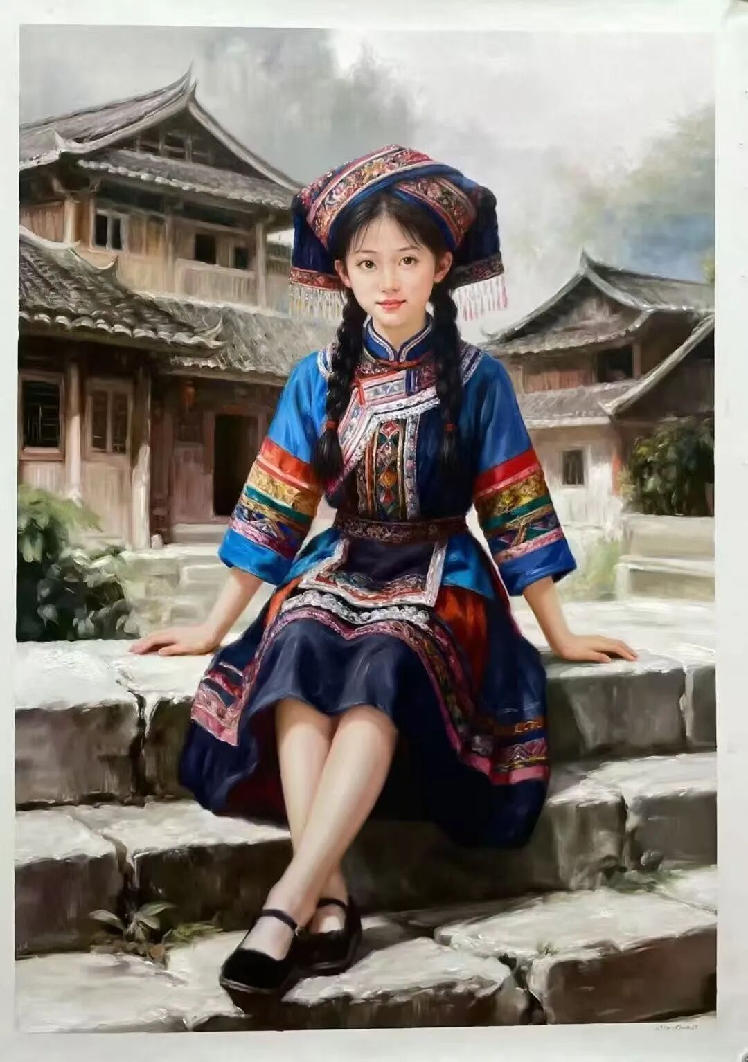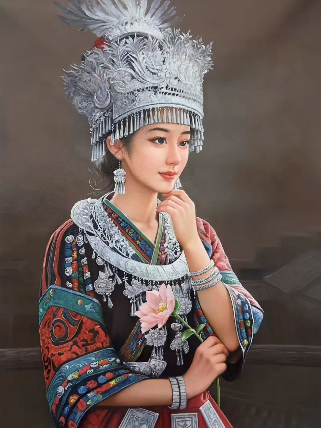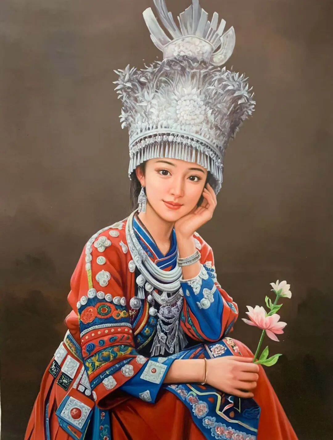 在中国当代艺术领域,周曦老师以其涉猎广泛、内涵深厚的油画人物作品独树一帜。周曦老师笔下的女性之美,首先是一种跨越题材的“大风格”的统一。无论是现代都市中凝思的知性女子,古典传说里温婉娴静的佳人,身着盛装、眼神清亮的苗族少女,还是戏曲舞台上水袖轻扬的旦角,她们都共享着一种由周曦独家赋予的“美的基因”。这种基因,体现在他对人物形态、光影和色彩无与伦比的掌控力上。