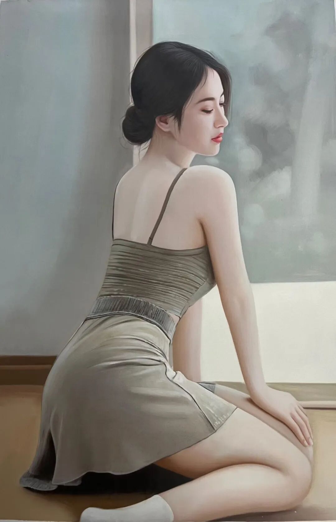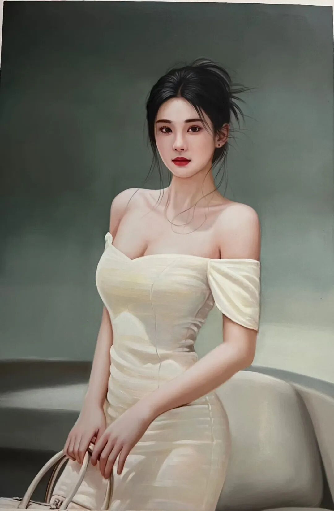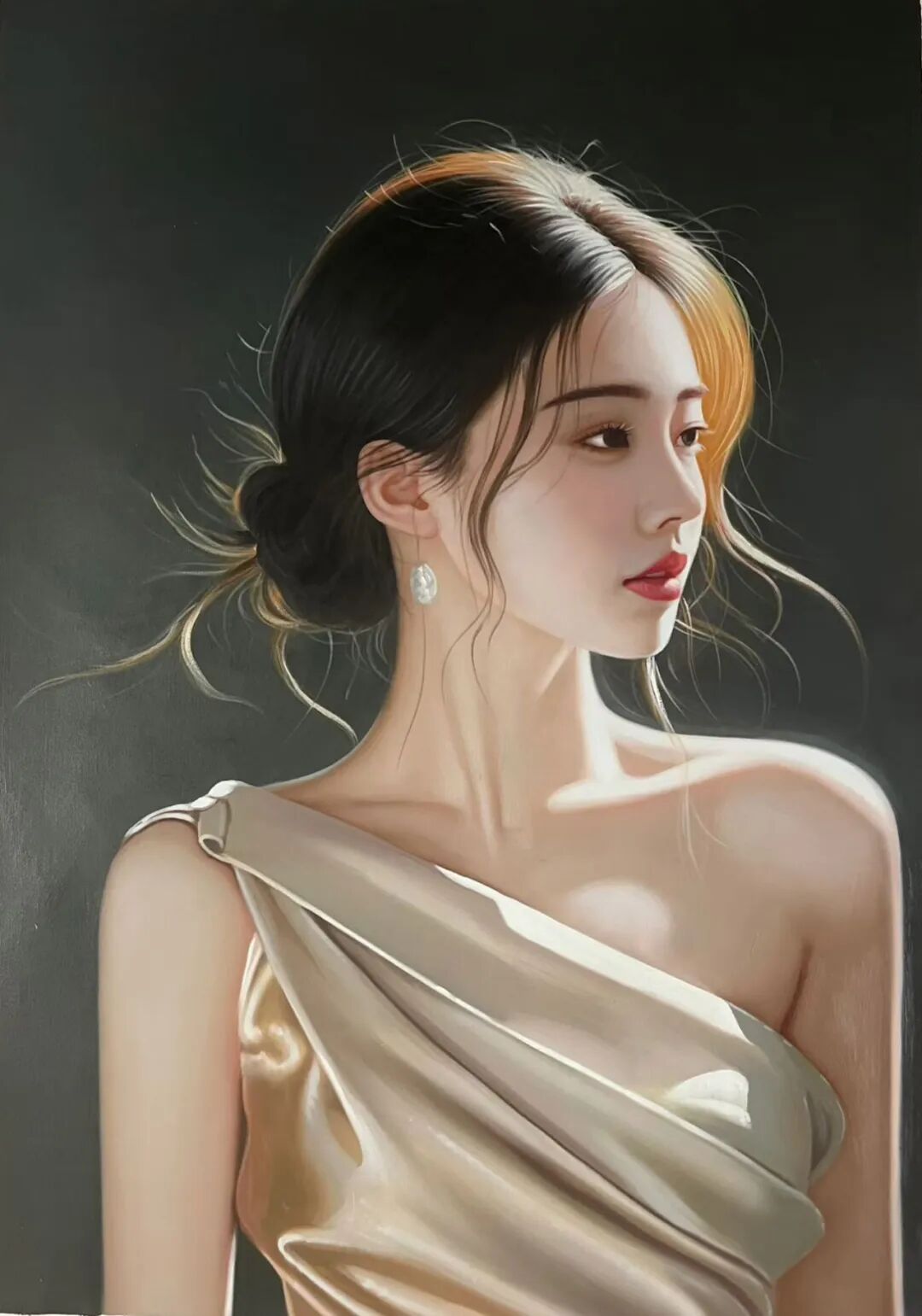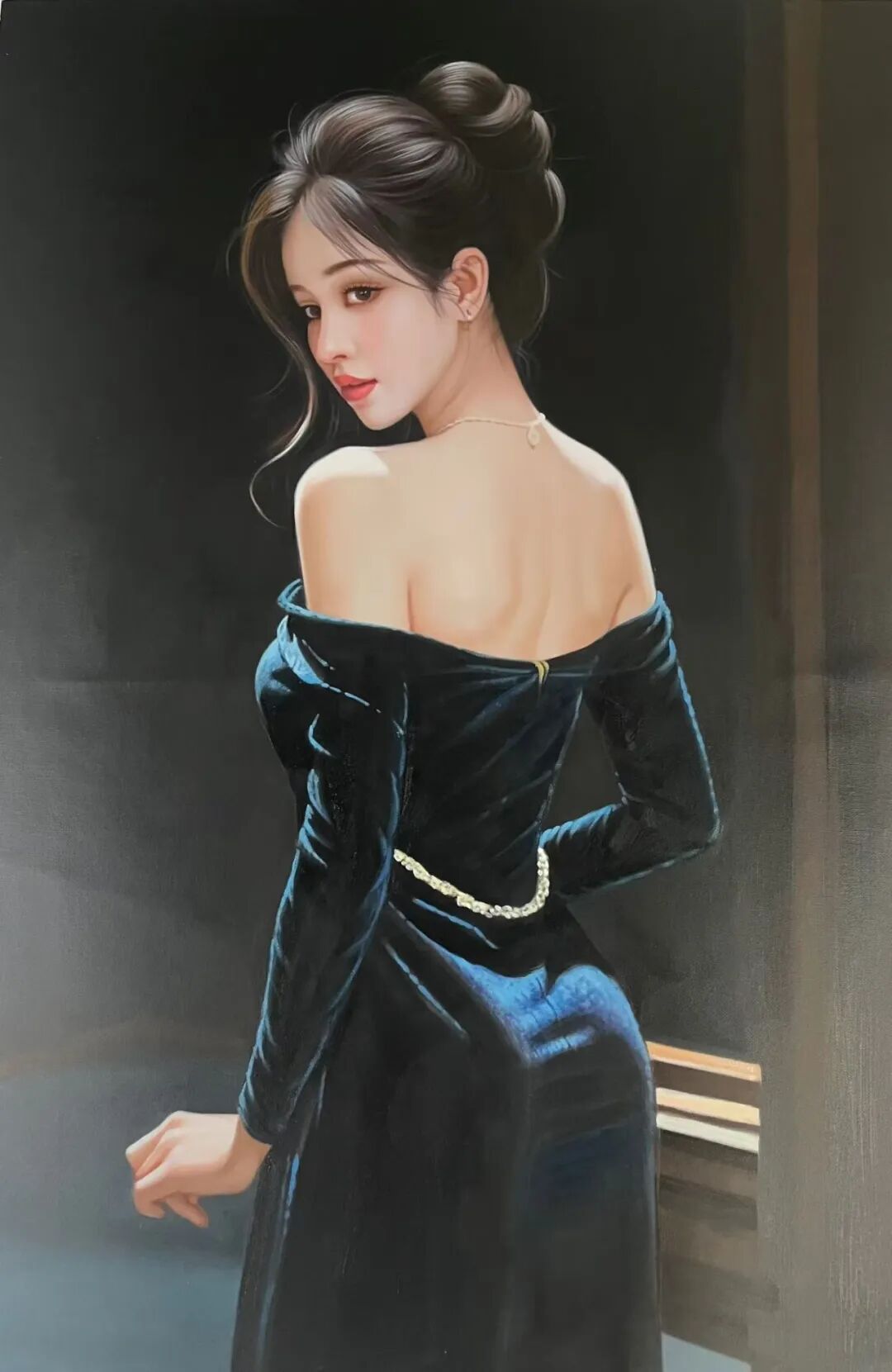 欣赏周曦老师的作品,发现周曦老师在形与韵的边界上,他找到了最微妙的平衡点。他的人物造型,既有西方古典写实主义的严谨与精准,每一处轮廓、每一寸肌理都经得起推敲;又饱含东方传统绘画的“写意”与“神韵”,不拘泥于形质的精确复刻,而重在捕捉气韵生动的美感。他画中的女子,身形颀长优雅,姿态自然流畅,既有磐石般的沉静,又具微风拂柳般的轻盈。这种形神兼备的塑造,使得他笔下的人物超越了肖像的范畴,升华为一种理想美的符号。