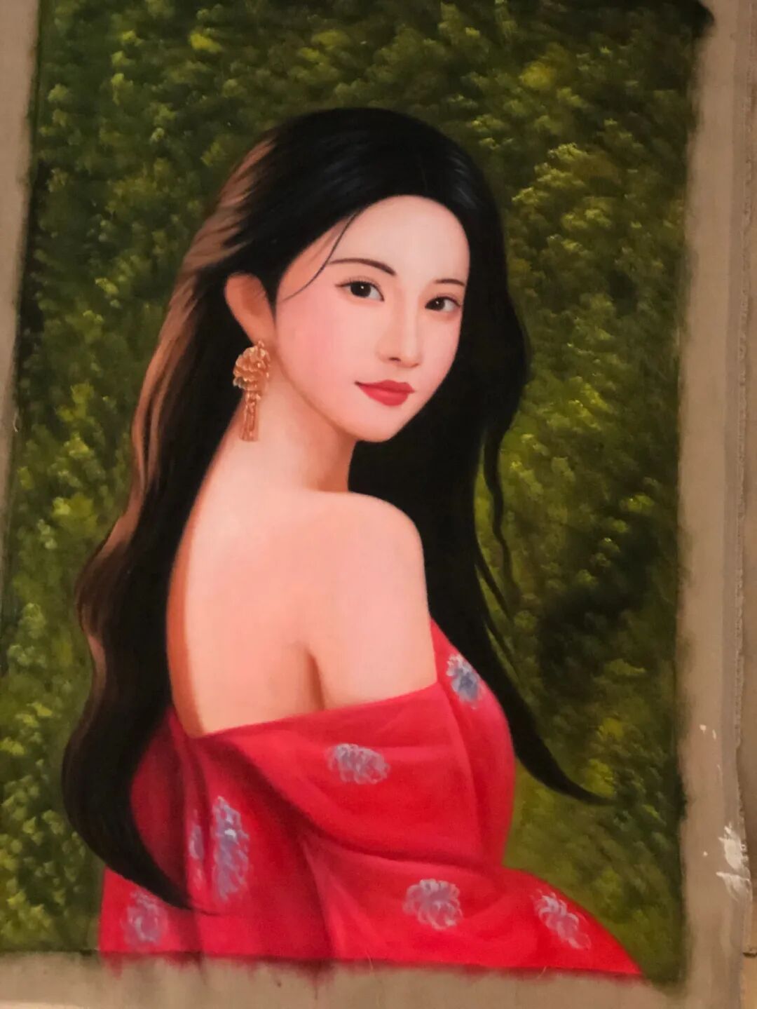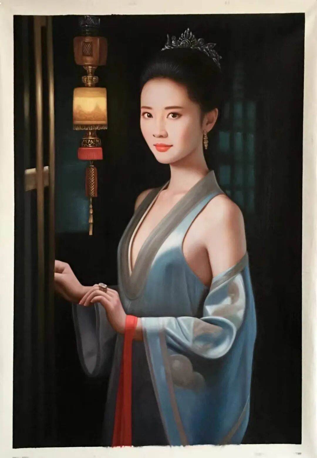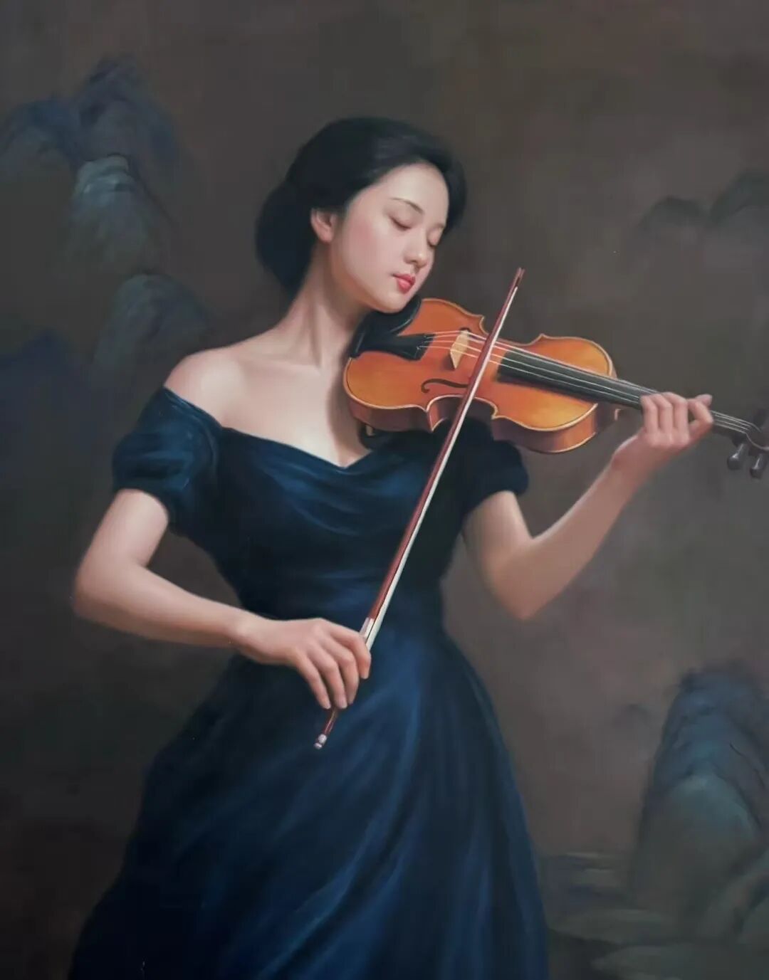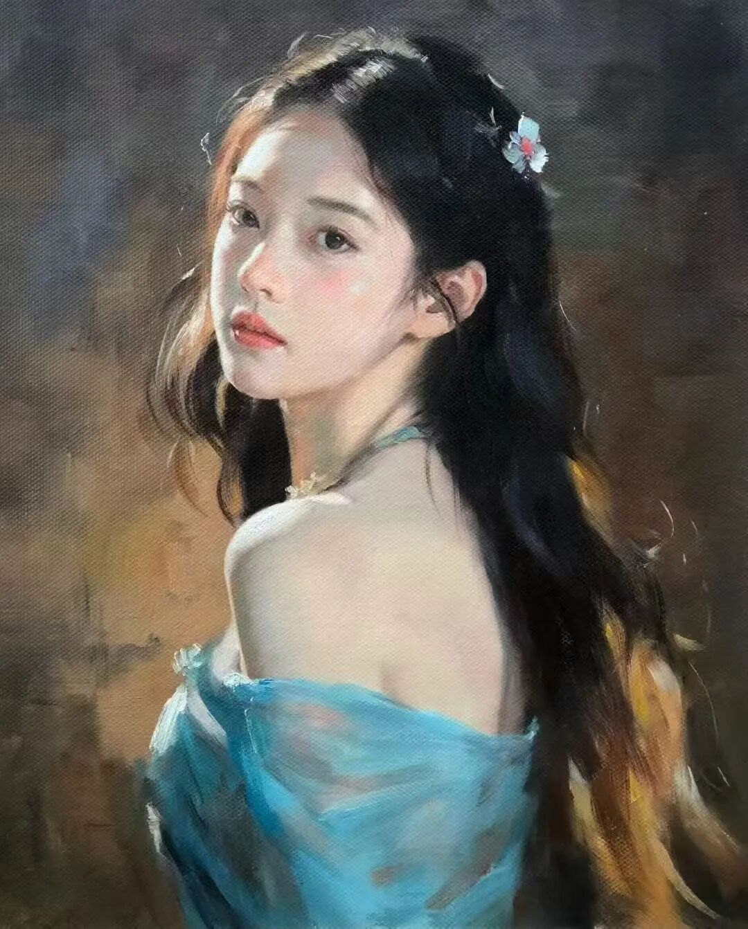 欣赏周曦老师的作品,发现周曦老师在形与韵的边界上,他找到了最微妙的平衡点。他的人物造型,既有西方古典写实主义的严谨与精准,每一处轮廓、每一寸肌理都经得起推敲;又饱含东方传统绘画的“写意”与“神韵”,不拘泥于形质的精确复刻,而重在捕捉气韵生动的美感。他画中的女子,身形颀长优雅,姿态自然流畅,既有磐石般的沉静,又具微风拂柳般的轻盈。这种形神兼备的塑造,使得他笔下的人物超越了肖像的范畴,升华为一种理想美的符号。