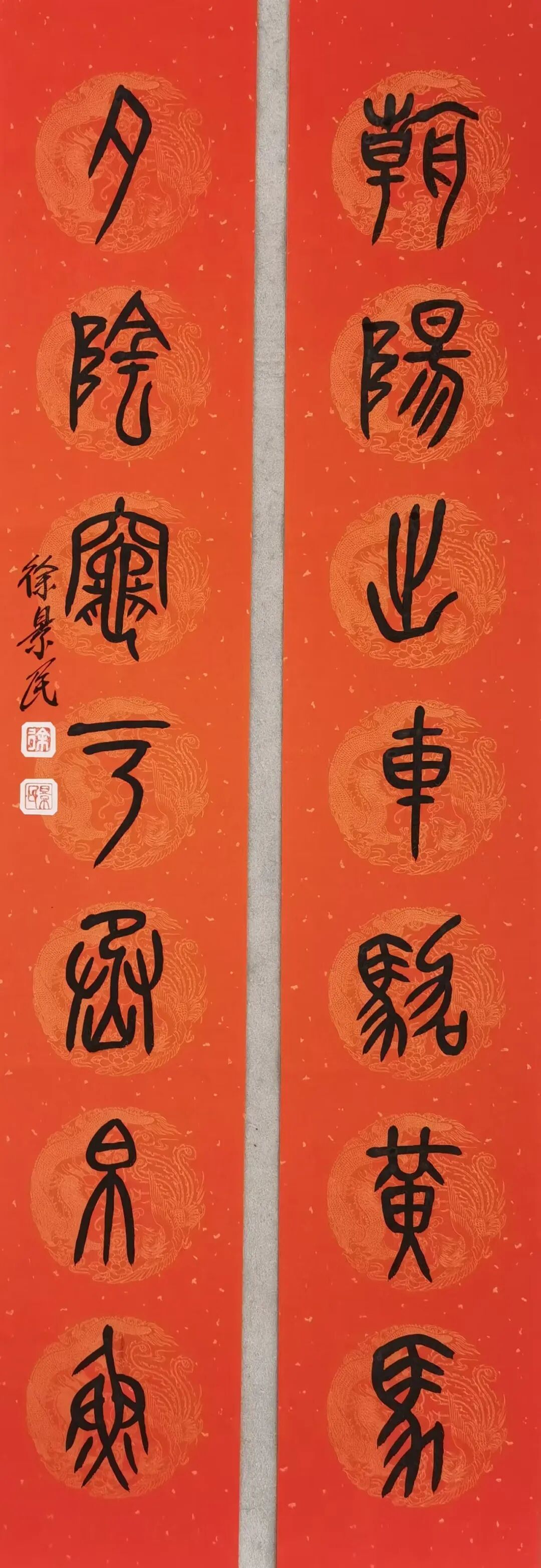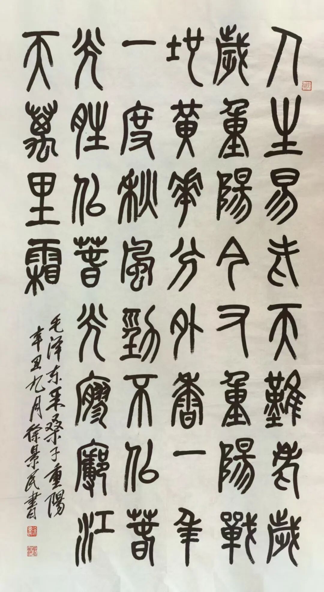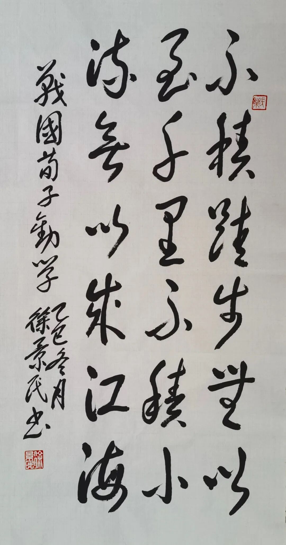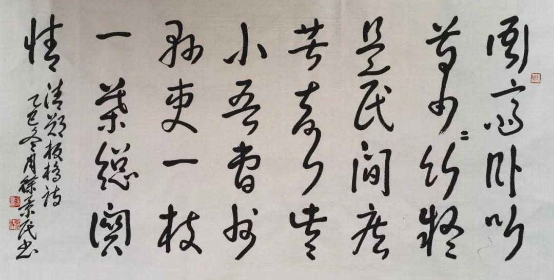 徐景民先生的艺术修养是全面的,其书画双绝,相得益彰。在书法领域,他同样展现出深厚的功力与融合创新的智慧。他临写的吴昌硕风格石鼓文,笔力千钧,墨色沉郁,将金石文字的古朴雄强表现得淋漓尽致。更为人称道的是,他巧妙地将篆籀笔意融入草书创作,取法于右任,笔下草书既保持了行云流水般的奔腾气势,又在线条深处蕴含了篆书固有的凝重与韧劲,形成了“篆草合一”的独特书风,在流畅与迟涩、飘逸与朴拙之间找到了完美的平衡点,展现出其对笔法掌控的精妙造诣。