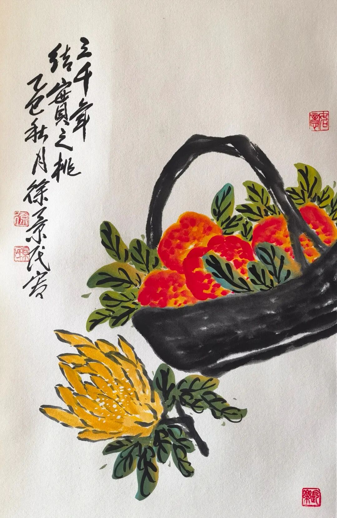 谈及徐景民先生的艺术成就,其笔下淋漓酣畅、色泽厚重的写意石榴图,无疑是其最闪耀的标志。他画石榴,深得吴昌硕“重、拙、大”之三昧,构图饱满,气魄雄浑。尤为值得一提的是他那独一无二的创作仪式与色彩奥秘——徐景民每次画石榴,像师祖吴昌硕公一样,先用虞山赭石制作的砚台磨制好矿物质赭成色,然后成图,这在全国可能是唯一。这虞山本地的赭石,经由他的匠心研磨,化作画面上沉厚温润、独具地质年代感的色彩,那石榴在他的笔下,仿佛吸纳了天地精华,果实饱满欲坠,籽粒晶莹仿佛包裹着光,在古朴赭色的笼罩下,既洋溢着蓬勃的生命力,又沉淀着金石书卷的厚重气息,形成了视觉与文化的双重震撼。