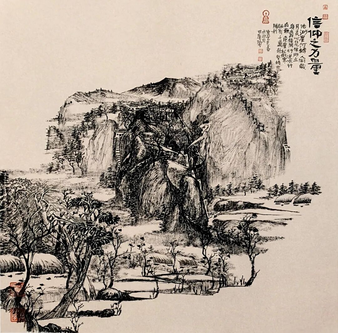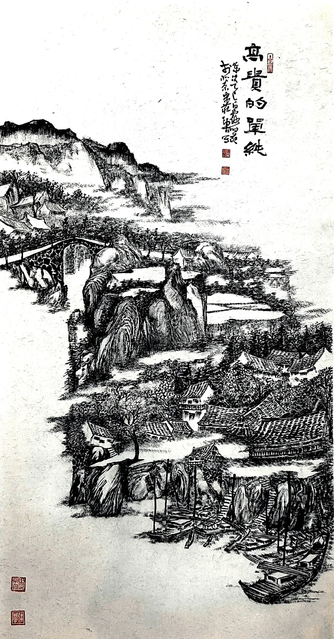 在陶古的焦墨山水中,神游首先体现为笔墨本身的生命律动。他的线条,不仅是造型的轮廓,更是情感与气韵的轨迹。一根看似描绘山脊的长线,其中蕴含的起伏、疾徐、轻重、涩滑,本身就是一场微型的时空旅程,是艺术家呼吸与心绪的物化。他的皴擦,密集处如夜雨扑窗,浑厚华滋;疏朗处如清风过隙,空灵通透。这些笔墨元素在画面上交织、碰撞、呼应,形成了一个独立自足、充满内在张力的能量场。观者无需借助文学性的叙事,仅通过凝视这些笔墨的行走与交响,便能感受到一种如音乐般抽象的节奏与韵律,从而被引入一个超越物象的、纯粹的精神场域,完成一次笔墨内部的神游。