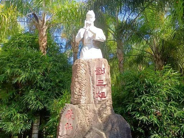 园内最引人注目的是那尊刘三姐雕像,她宛如从山歌中走来的精灵,穿一身壮锦长裙,手捧绣球,亭亭玉立,飒爽英姿。发间银饰闪着雪亮的光芒。她面带微笑,眉宇间流露着聪彗与机智神情。微扬的嘴角仿佛正在唱着那句“唱山歌来,这边唱来那个边和一一”的山歌。最妙的是那双人会说话的眼睛,饱含深情,让每个驻足的人耳边都能响起那穿越千年的天籁之音。