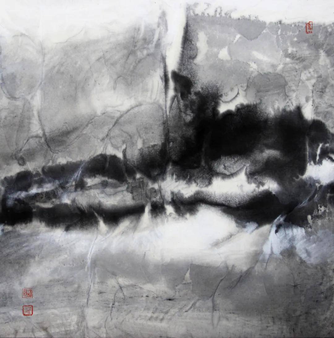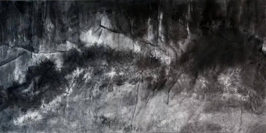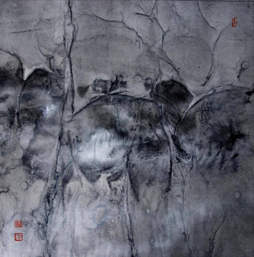 其次,张涛的绘画语言是纯粹的,具有随机性和偶发性。他使用多种材料不局限水墨,还有丙烯、矿物质颜料等,绘画上使用传统的笔法皴、擦、结合滴洒 水渍、沙石、拓印等现代手法,创作出不同质感和异样视觉。在有意和偶得之间自省和解放。因此他的作品有具象的画面,也有意会的画面,还有抽象的形。同时,画面抽象、流动、虚实相生,即保留中国传统画的意境与留白,讲究气韵生动,然而又不同于中国画的图式,更多呈现的是“山之所以为山的”精神世界.