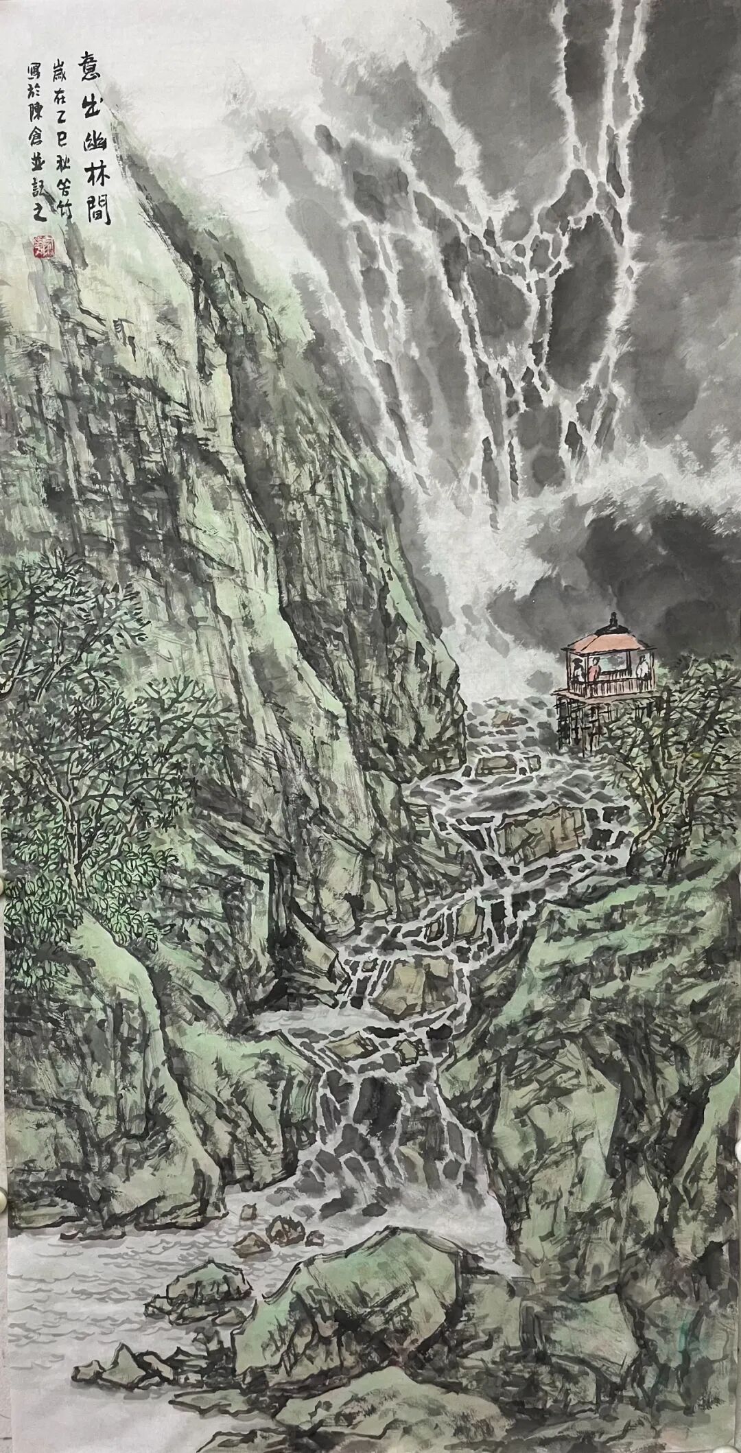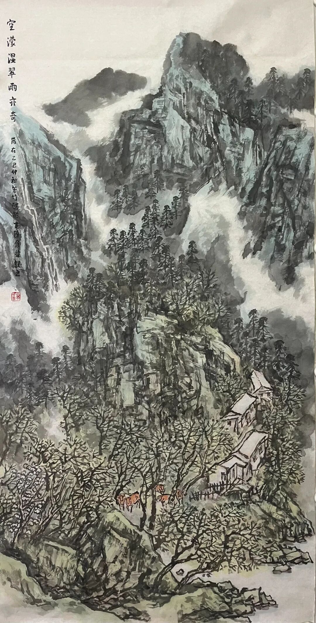 这种“天青色”,既有秦岭苍茫之气,也有江南六朝的烟水之气。因为一脉烟水,秦家华关于秦岭山水的表现,便和大多数陕西画家拉开了距离。他不再一味地强调拙朴厚重,也不刻意乡土意味,而是在清润中追求秀美。出人意料的是,他作品中的秀美,是通过高山大川来实现的。在他的笔下,沉郁顿挫与飞扬飘逸,合二为一。