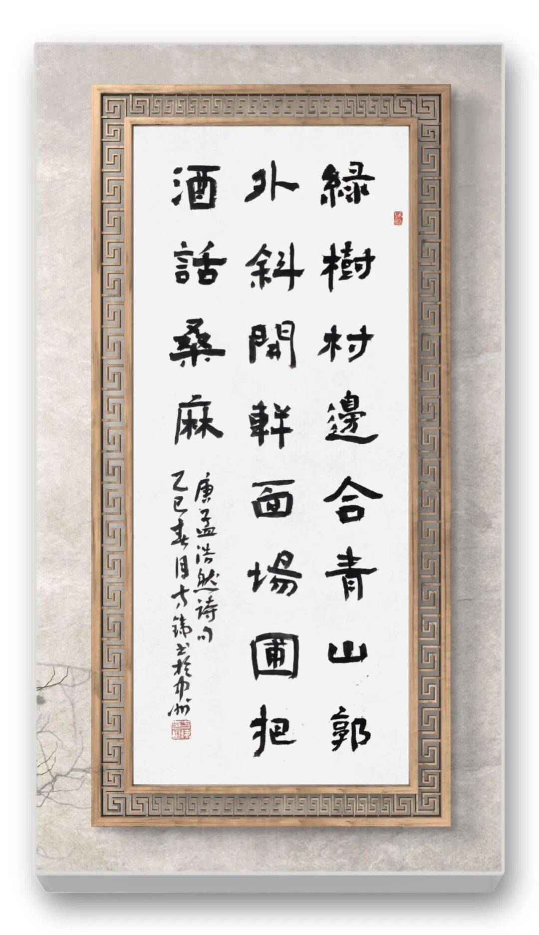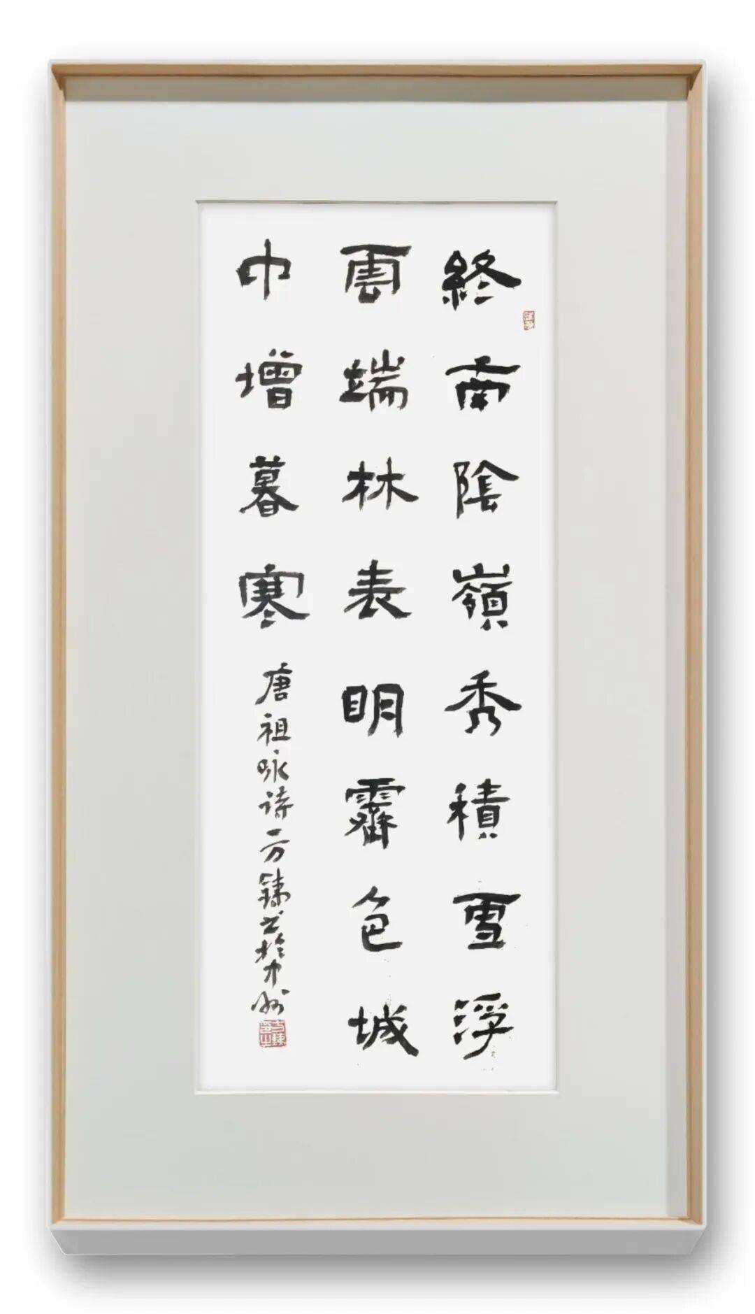 除了笔法之外,方铁先生对汉隶结字规律的把握也达到了炉火纯青的境界。汉隶结字讲究“蚕不二设”“燕不双飞”,结构匀称端庄,疏密对比得当。方铁先生在创作中,既严格遵循汉隶的结字规范,又善于根据文字内容与整体布局进行巧妙调整。他的隶书作品,单字看结构稳固、疏密有致,整体看则行气贯通、章法和谐。如他的隶书,每个字都占据着恰当的空间,笔画之间相互呼应,疏密对比恰到好处,既展现了汉隶的端庄大气,又通过字与字之间的呼应关系,营造出开阔雄浑的意境,与曹操诗歌的豪迈气概相得益彰。这种将文字内容与书法形式完美融合的能力,正是他深入理解汉隶精髓的体现。