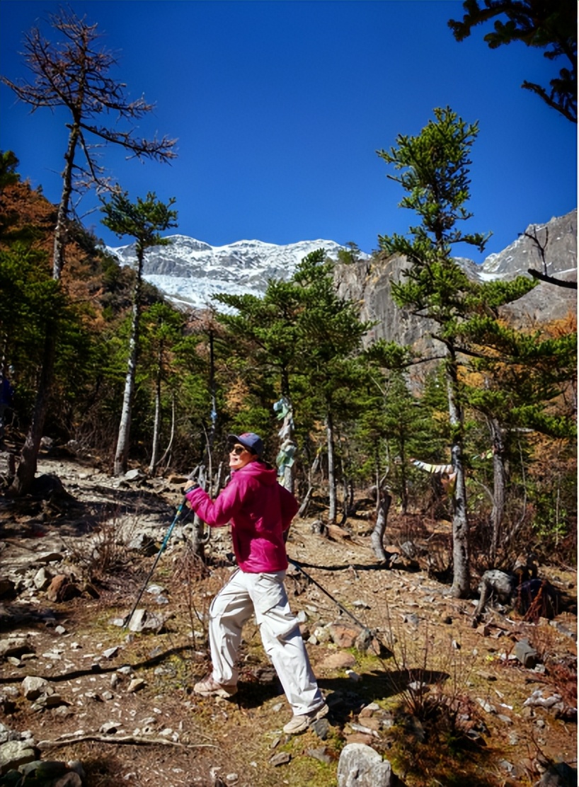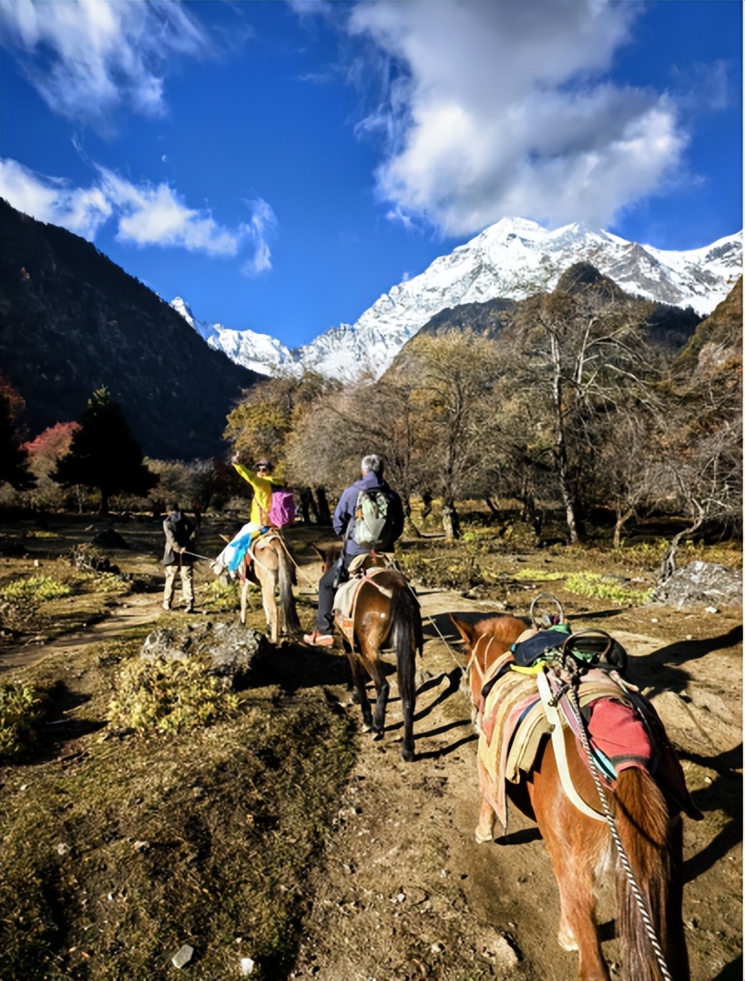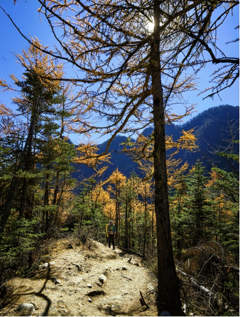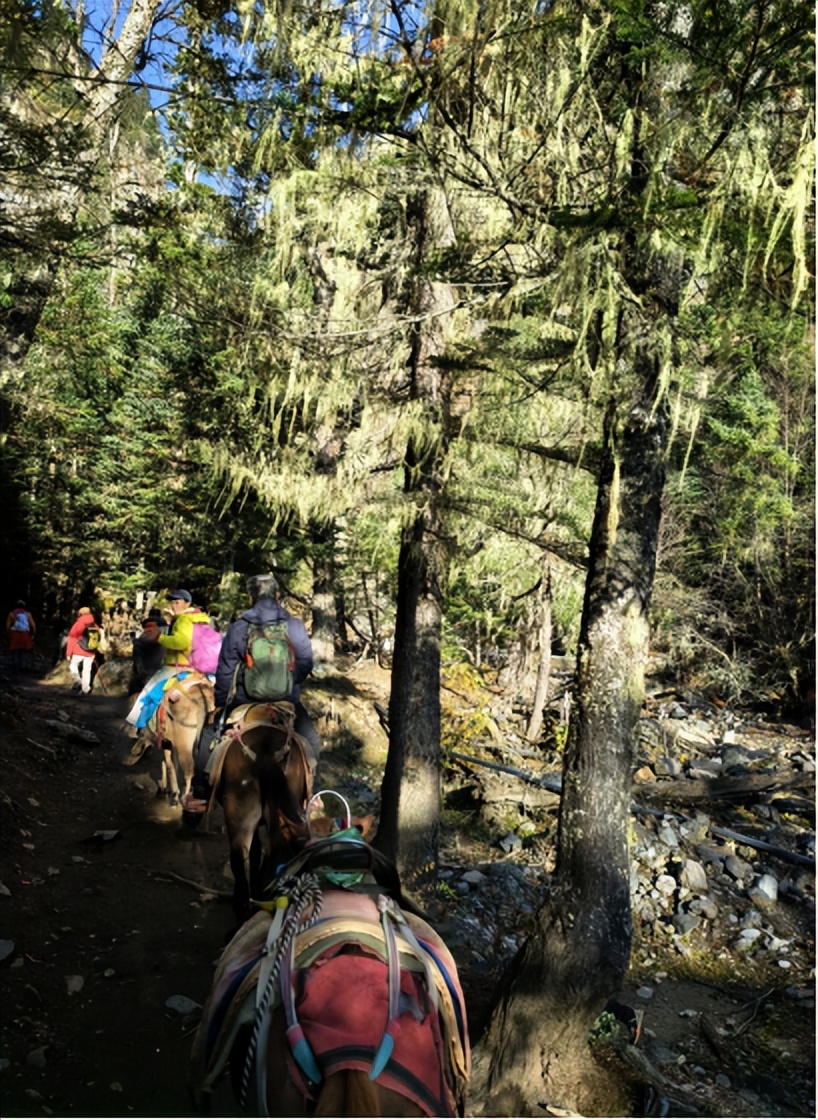 一路上来,基本靠骡子代步,体能储备充足。起步前行,沿溪边小径继续向冰湖挺进,虽是3600米以上的海拔,但行走起来并未感到费力,即使上坡拔高,仍是轻松自如,一边欣赏着路上的风景,一边悠悠上行。这段小路,景色极美,针叶枯黄的落叶松与翠绿的云杉交织在一起,在蓝天、雪山的映照下,宛如一幅层次分明的油画,美得令人窒息;逆光中的松林朦胧梦幻,让人宛如进入了神的后花园。据说每年春季,这里的高山黄杜鹃满山遍野,璀璨夺目,如诗如画,可惜来的不是季节,赏花只有待来年了。