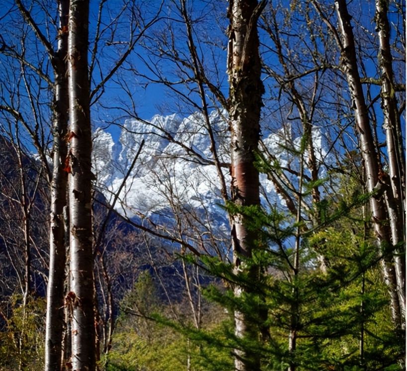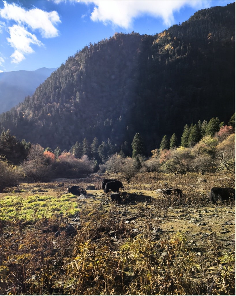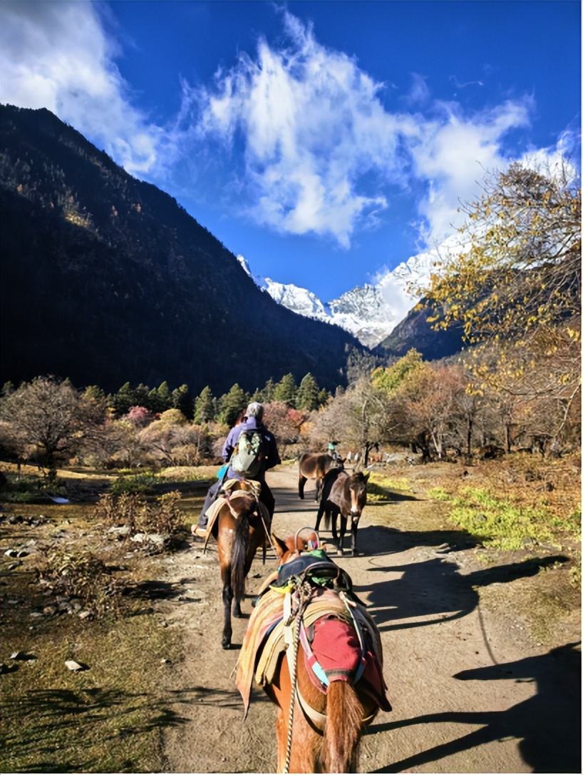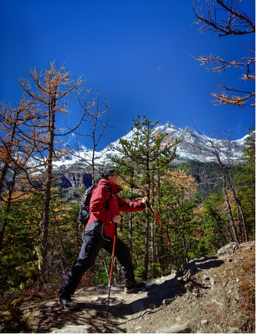 一路上来,基本靠骡子代步,体能储备充足。起步前行,沿溪边小径继续向冰湖挺进,虽是3600米以上的海拔,但行走起来并未感到费力,即使上坡拔高,仍是轻松自如,一边欣赏着路上的风景,一边悠悠上行。这段小路,景色极美,针叶枯黄的落叶松与翠绿的云杉交织在一起,在蓝天、雪山的映照下,宛如一幅层次分明的油画,美得令人窒息;逆光中的松林朦胧梦幻,让人宛如进入了神的后花园。据说每年春季,这里的高山黄杜鹃满山遍野,璀璨夺目,如诗如画,可惜来的不是季节,赏花只有待来年了。