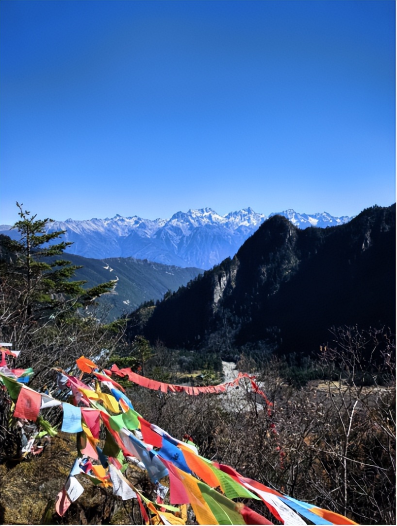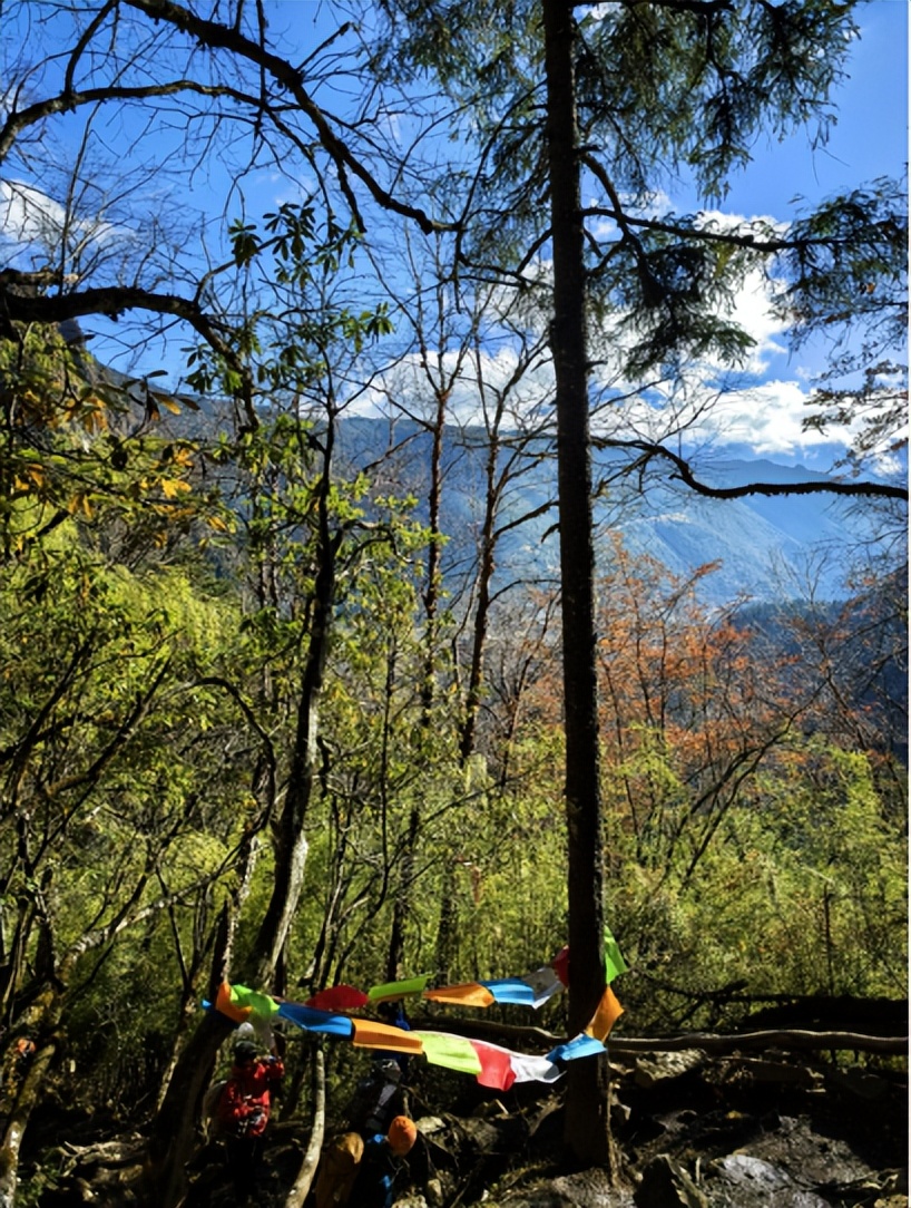 走出这片如梦似幻的松林,转眼来到乱石嶙峋的溪边,感慨一番自然的威力,欣喜踏过挂满经幡的小桥,开始向冰湖发起最后的冲击。