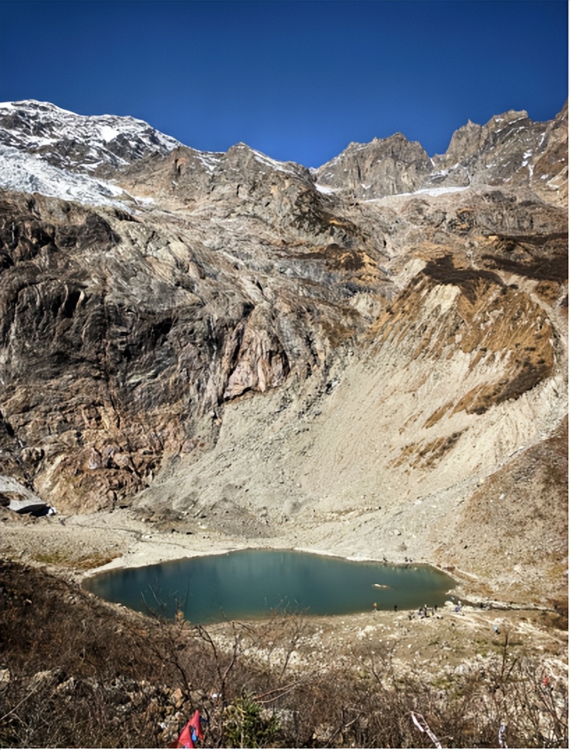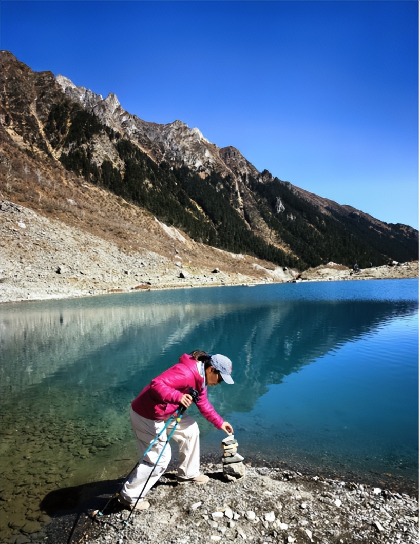 沿着陡峭的小路一步步下行,一步步走进那幽蓝神秘的湖水,踩着湖边的碎石绕湖一周祈福,怯怯地抵进垂直崖壁下,那几乎悬在空中的冰川,突然之间,那刚刚征服的喜悦荡然无存,一种对自然的崇拜及敬畏之情油然而升。“登高必自卑”,在大自然面前,人类实在太渺小、太微不足道了。