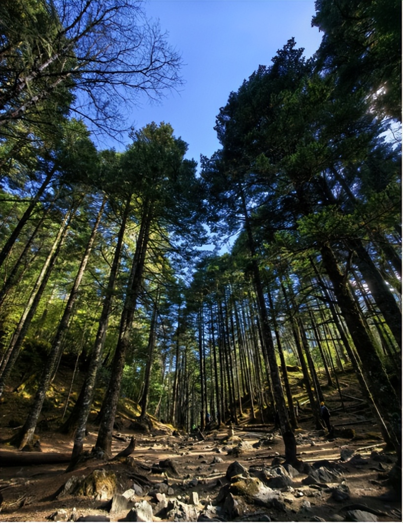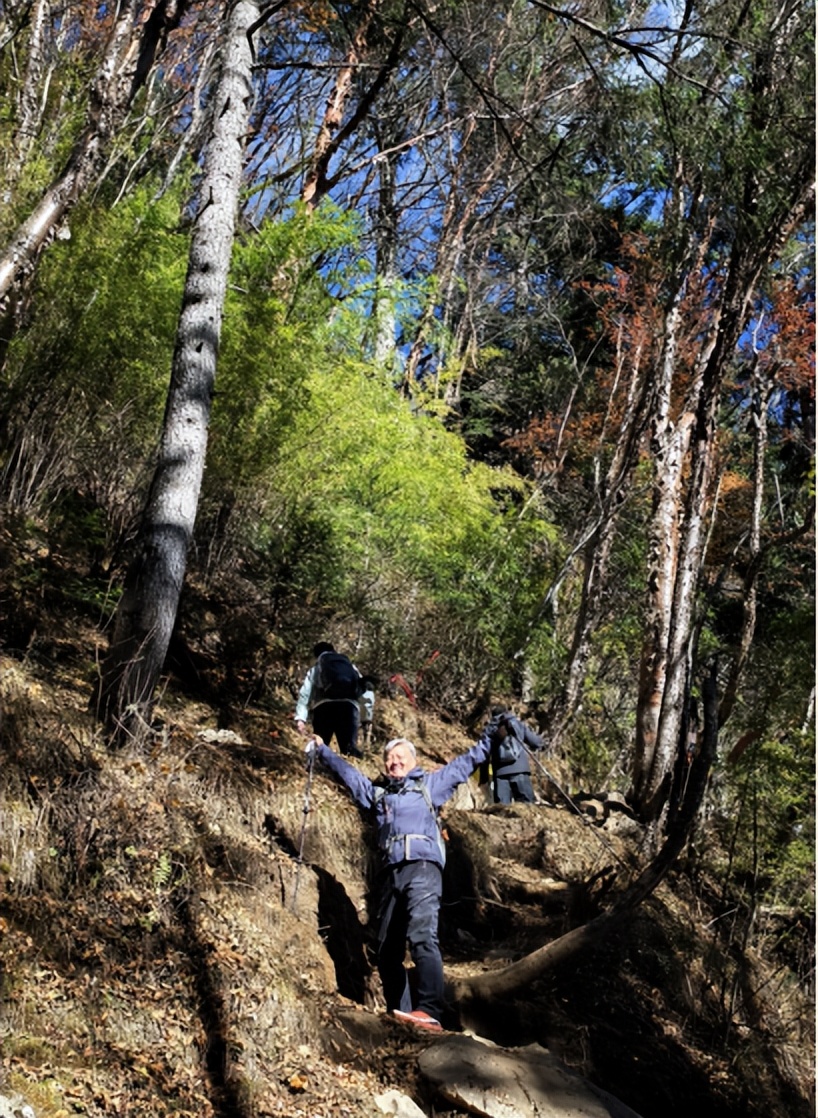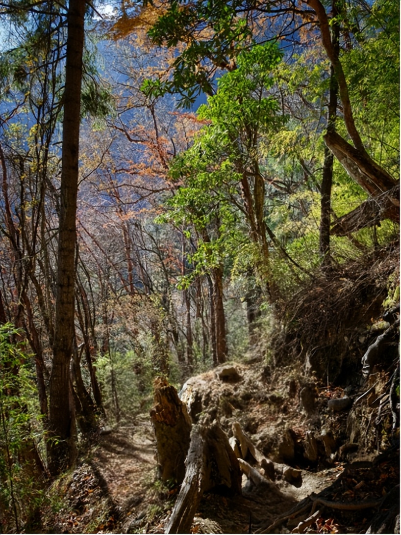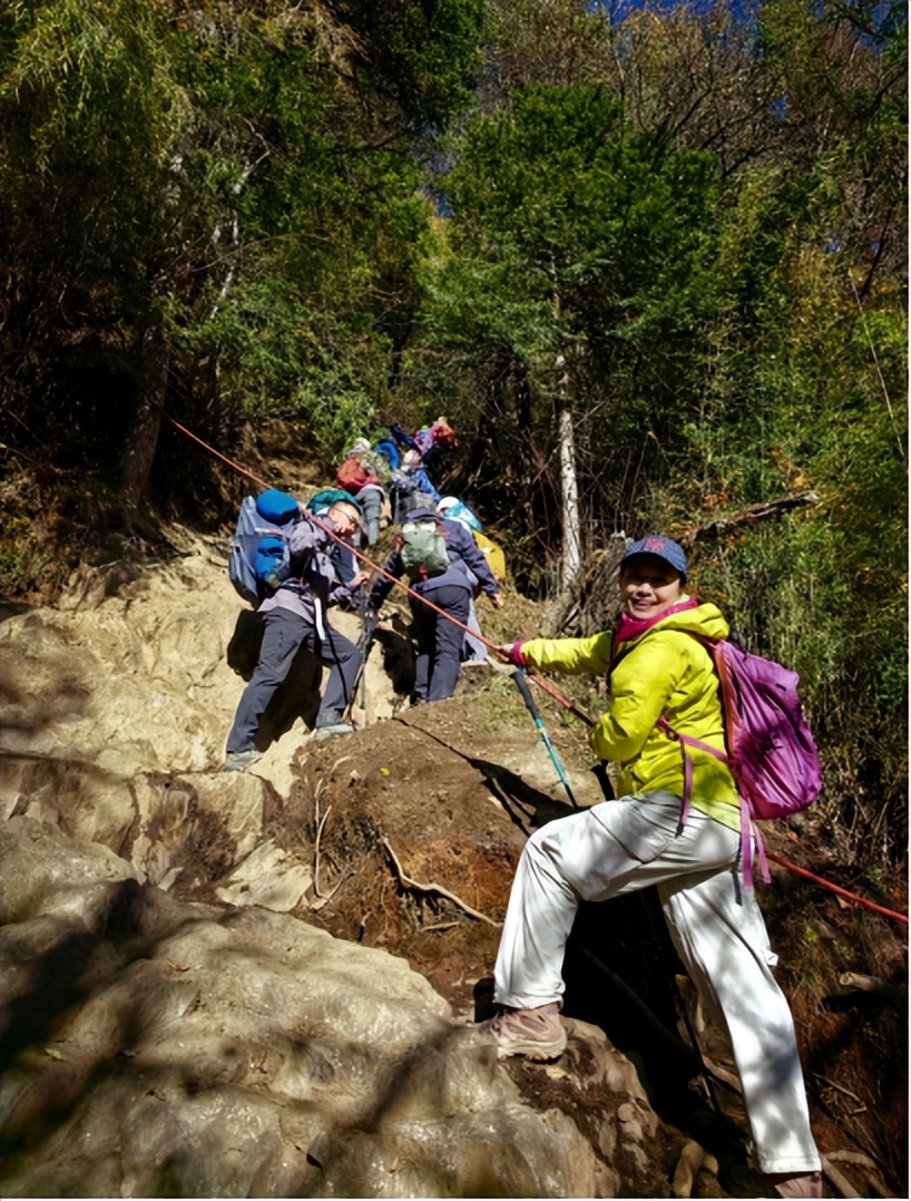 从坚硬的水泥路面,一步踏进松软的泥土小径,踩着厚厚的落叶,心像吃蜜样的甜。这才是俺徒步喜欢的感觉啊!蹬着裸露地表的树根,穿过一棵棵高大的古树,拽着身旁的灌木,小心蹦过一洼洼的积水,四肢发力,稳步上升,惬意悠然。两截一米多高直立枯死的树根,横在路的中间,抚摸而过,粗糙的纹理,好似岁月刻下的神秘符文,每一道沟壑,仿佛都在诉说着这片森林的古老故事,令人忍不住停下脚步,细细端详,遐思无限。继续上行,一段陡坡上下,汇集了众多的驴友,细看,原来大家都在拽着安全绳有序攀爬。这救命的安全绳垂在这里,不仅让人省却了攀爬的许多体力,更令人欣慰的是其确保了上行每个人的安全。户外,总有那么多无私细心,总为他人着想的好人!喜欢户外,不能不说这是个重要的原因。