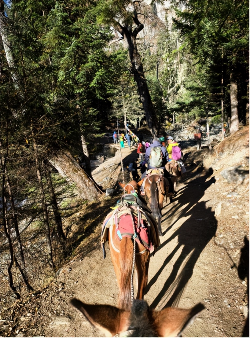 僵硬着身子坐在骡子上前行,东倒西歪,战战兢兢,总担心不小心摔下来,那还有心赏景。直到十几分钟后,身体与骡子的配合才渐渐和谐起来。轻松、欣喜、惬意的感觉一上头,那眼和手就闲不下来了。一只手用力抓着骡鞍子上的铁条,一只手蹭掉手套就掏出了兜里的手机,开始不停地摄入行在前面的“崖在、洋洋”及身边的景色。