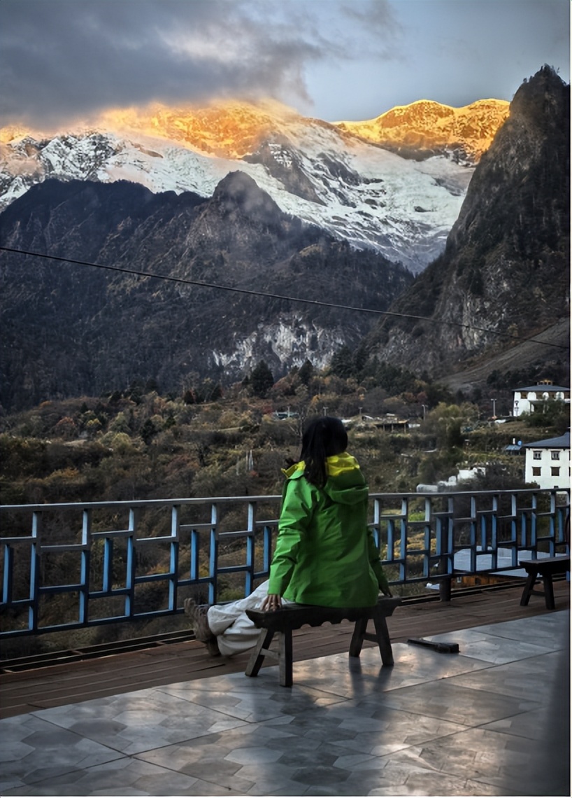 端坐在平台的长凳上,静静地看霞光漫卷,尽情享受着晨曦里的宁静、温馨、浪漫,雨崩,“人家天堂”的称呼,确实名不虚传。