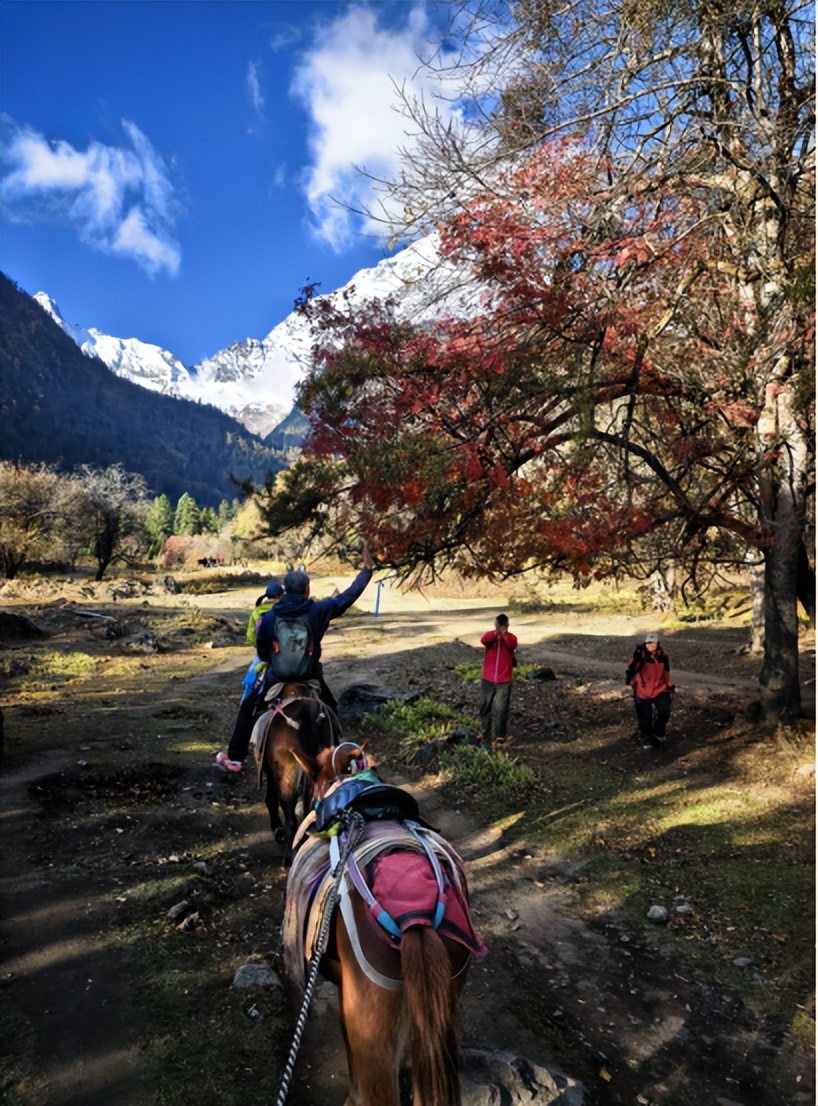 “人在画中游,画在景中走”,骑在骡子上的我们,一不小心,竟成了画中的焦点,许多徒步的驴友,纷纷拿着手机,摄录着我们悠悠骑行的画面。一棵娇美的红枫下,一对年迈的老夫妻,早早架好机位,等待着我们进入视野,那份摄影人的专业和虔诚,令人感佩。挥挥手祝福他们地老天荒,开心快乐!畅然前行。