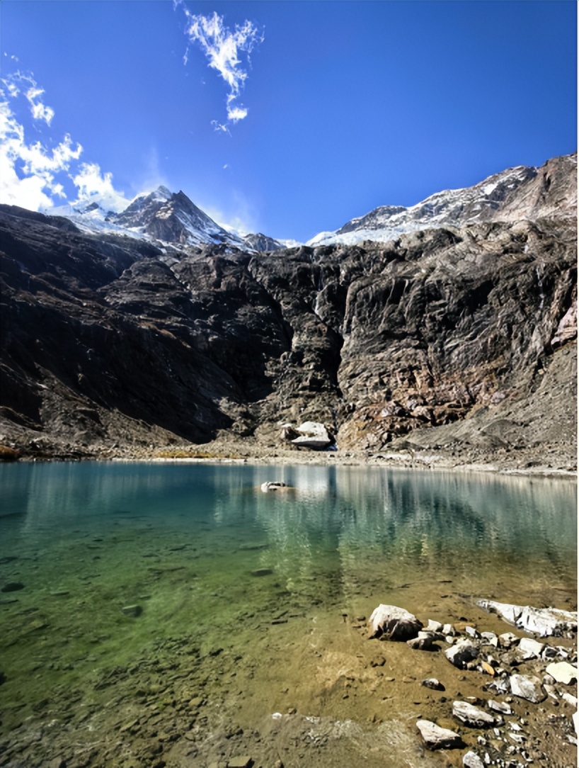 静静地伫立湖边,仰望着蓝天、雪山、冰川,凝望着波平如镜的湖水,忽然,一种想永远留下来的念头,竟从心底肆意疯长。一阵清风吹过,湖水像泼进众多染料一般,瞬间变成了湛蓝,神奇的犹如梦幻一般。