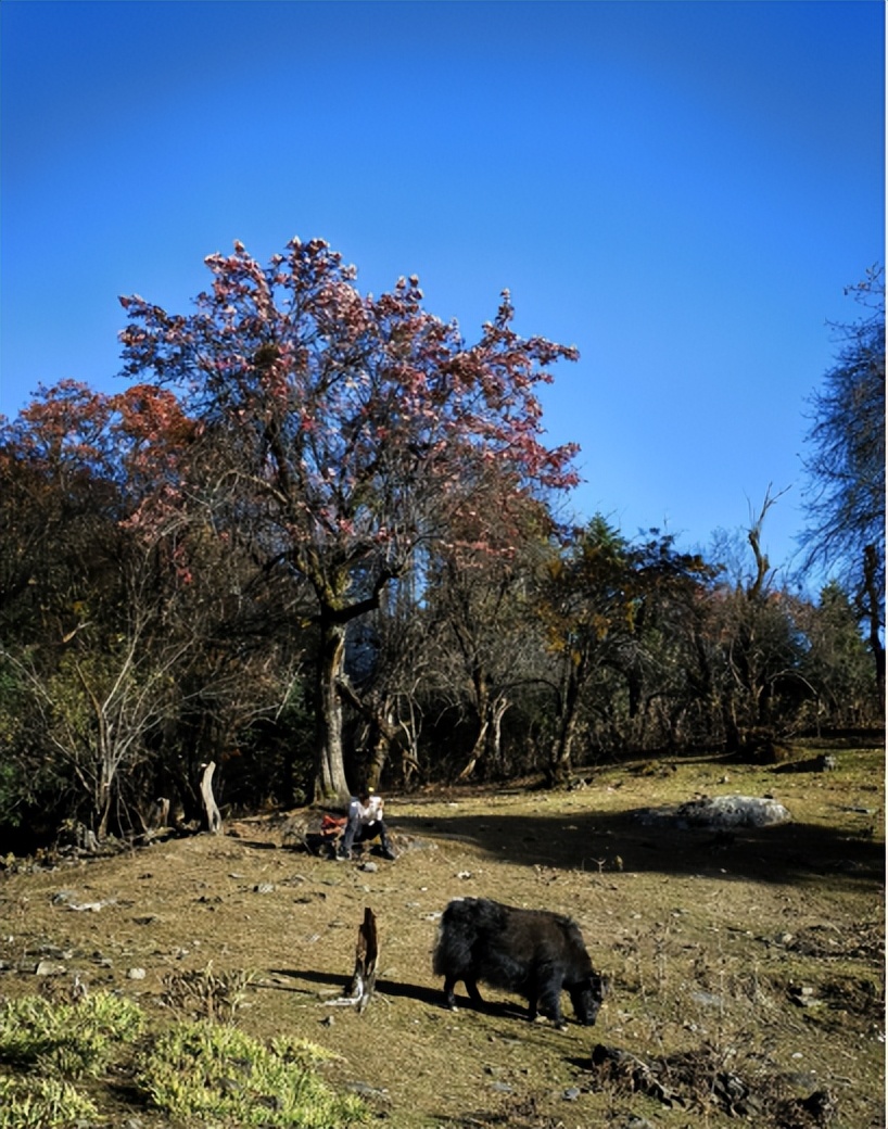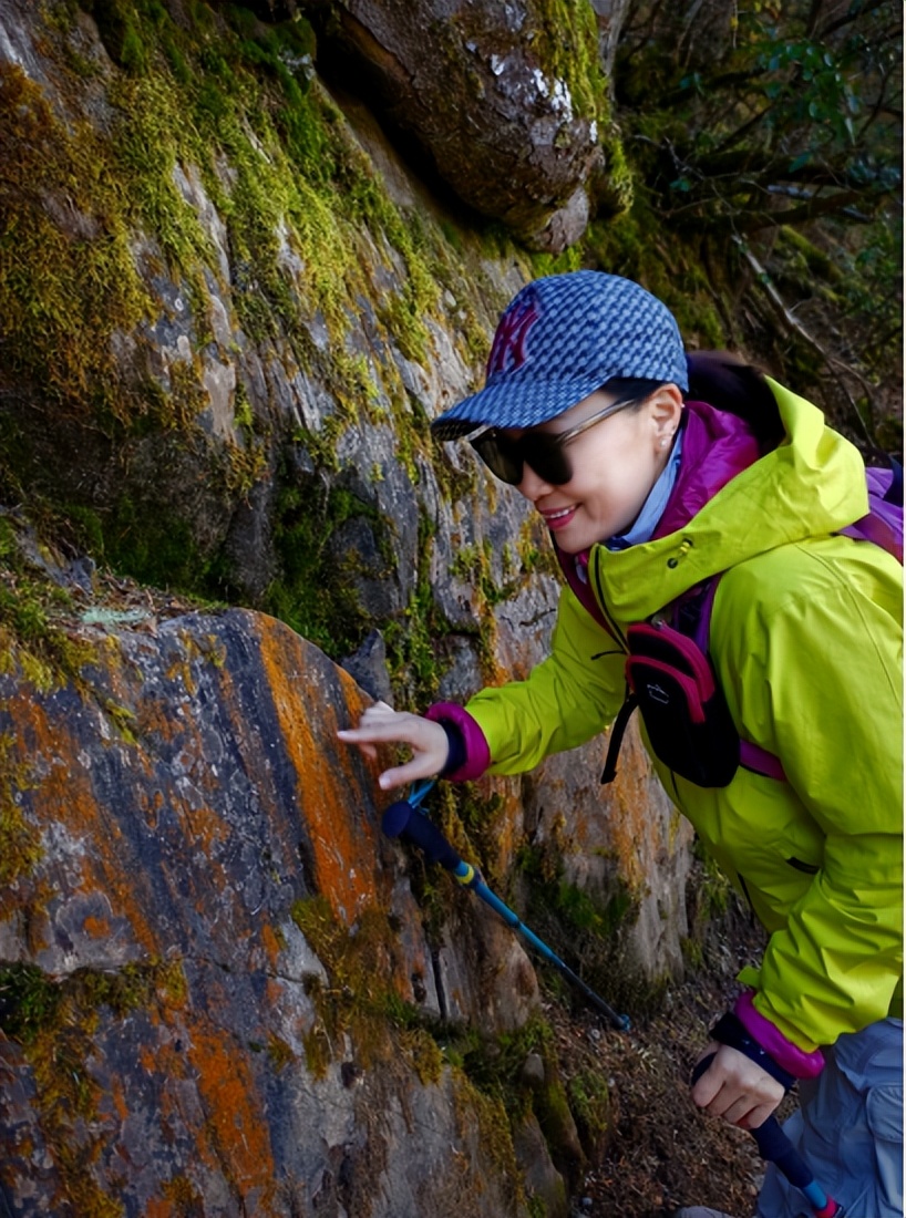 从垭口下行,是一段崎岖陡峭的小路,安全起见,扎西兄弟又把我们赶下了骡子,不过这也恰好给了我们仔细观赏路边景色的机会。你看“洋洋”,在山崖下一块斑斓的巨石下停下,正用手触摸着石壁上红的、绿的、灰的、黄的等各色苔藓,感叹着自然的神奇。一棵古树下面一个硕大的树洞,又引起了她的好奇,也不管三七二十一,大步就向那树洞奔去;大白天的树洞里能有什么,难不成是要与“熊大、熊二”约会,可这路边、这季节,它俩指定不在里面。