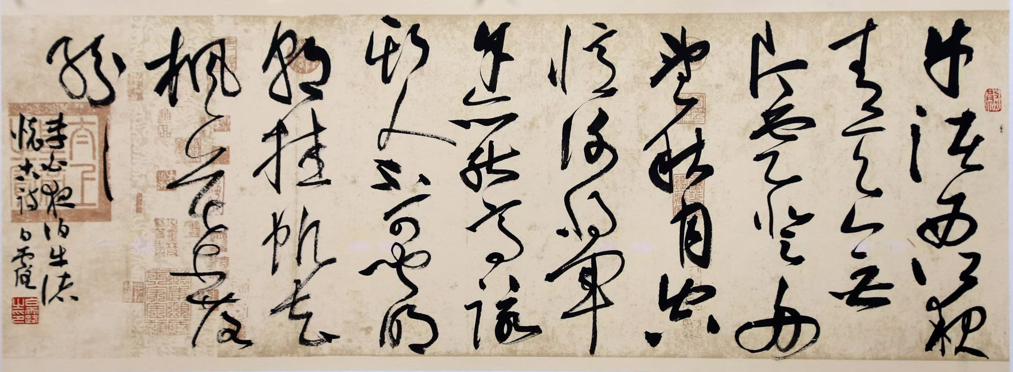 我突然觉得,我最大的愿望就是去观赏白露先生的草书风格,那里有别有洞天的艺术境界,争奇斗艳的风姿旋律,仿佛让人体验到狂风暴雨,古漠大风的激烈壮阔,又感到丽日和风,幽兰空谷的清爽柔和,品味到满汉全席的酸甜苦辣,如此乎,甚好!甚好!