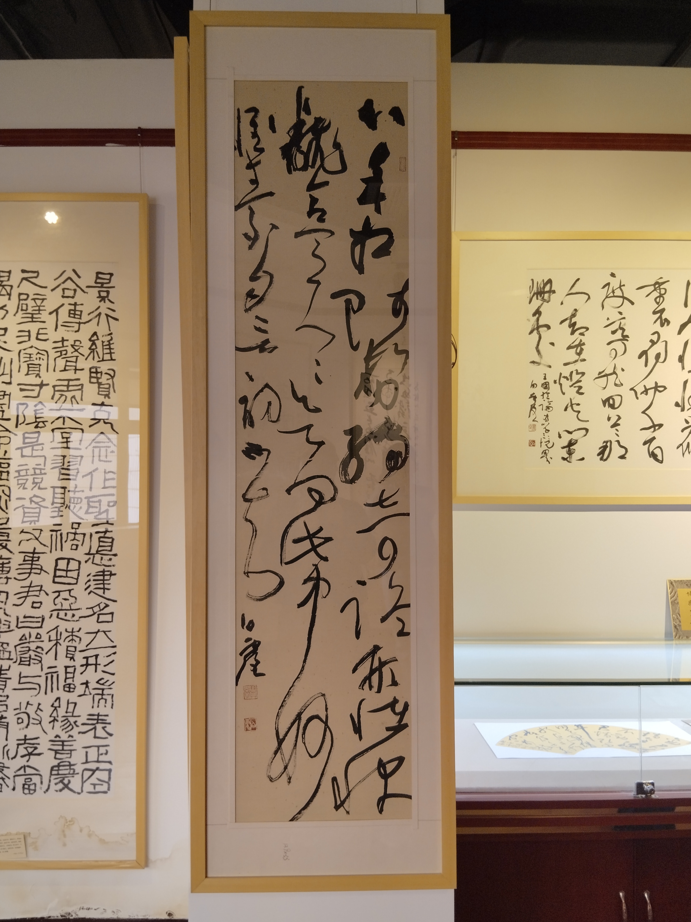 随后,先生带我们去观看他的书法展馆。整个展厅里,挂满了他两年来的书法精品,他的楷书端严如君子立堂,隶书古朴似老松盘根,行书则如流水遇石,缓急有度,尤其是他的草书,真乃笔势如龙蛇游走,提按转折见功底,墨色枯润藏韵味,字里行间又带着一股子洒脱豪放气度,既见传统功力,又有鲜活性情。好啊,我从心里来讲就是一个好!这时候我融入了他的书法殿堂,像是在这个初冬的季节,风扫着落叶,一部完美的草书景象。