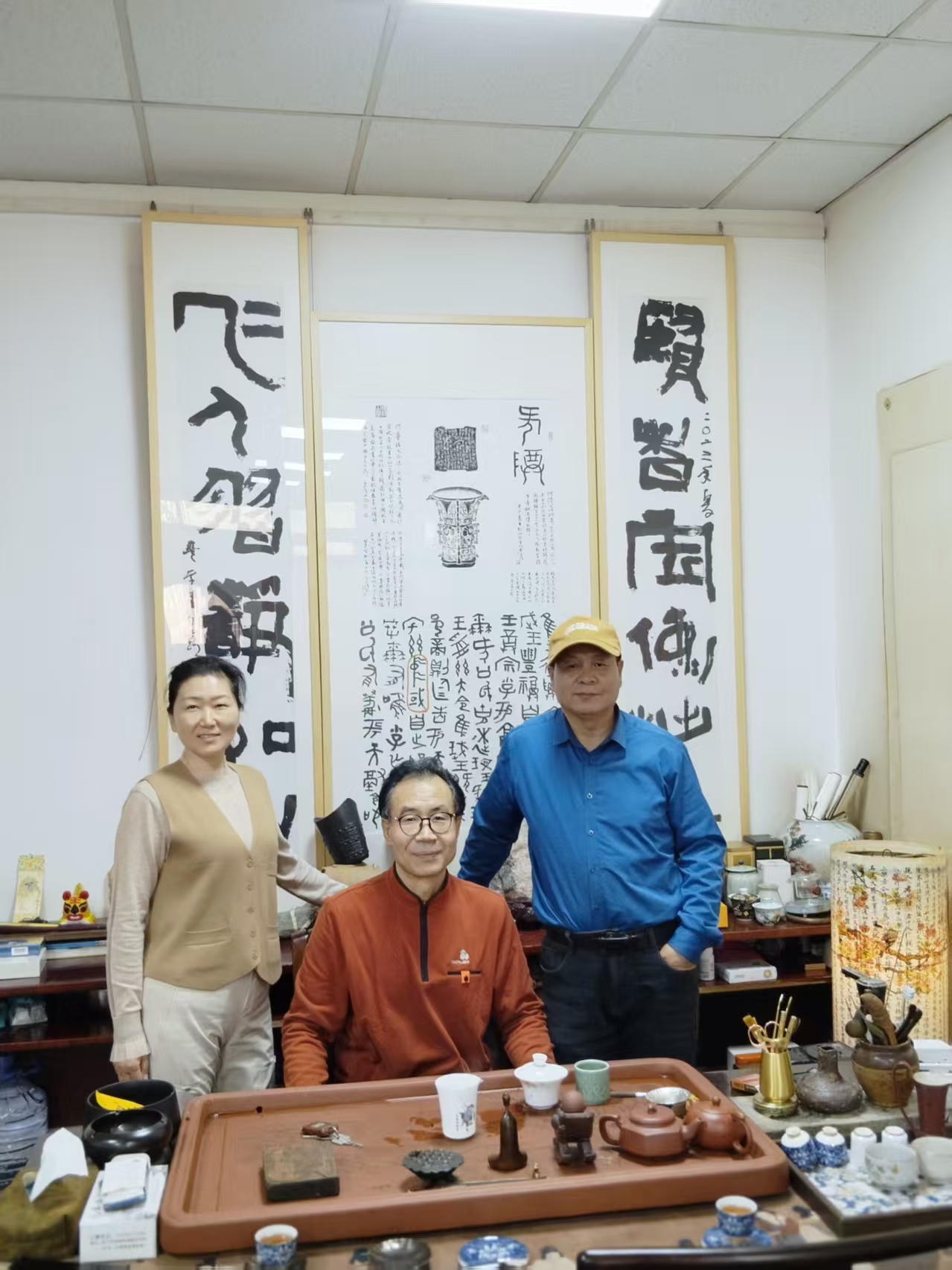 我们围坐案前,听先生聊书法的历史,从大汶口陶器符号讲到唐宋的法度,他说:练字如做人,急不得!赵榕老师说:先生写这么多,从不觉得累吗?先生笑着摇头说:喜欢就不累,有时写到深夜,窗外的灯都灭了,就是我桌案上的灯还亮着,依稀古人才能懂。这墨香裹着真诚,心里踏实啊!先生语言生动,也让我们感动。