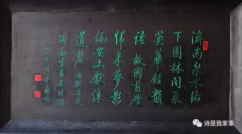 为弘杨拓展李清照诗词文化,全面展示李清照精妙诗词,在李清照纪念堂院内刻制部分诗词。1988年园林主管部门委派李苦禅纪念馆负责人郭景山先生向全国征集名家书画作品。在时任中国书法家协会副主席欧阳中石先生指导协调下,他北去南下,定向征集到一批书法名家撰写李清照词或与其有关的诗文。经有关领导和专家组确定启功、费新我、沈鹏、大康(康殷)、王轶猛(台湾)、吴未醇、刘征、王学仲、萧劳、吴文蜀、颜家龙、兰阔、王遐举、李鹤年、意庵(金意庵,爱新觉罗·启族)、林鹏、楊鲁安,林鹏、孙其峰、欧阳中石、蒋维崧、徐无闻、魏启后、宗惟成作品入选,1990年刻立28方李清照词碑石,镶嵌在李清照纪念堂东廊。