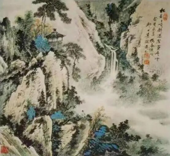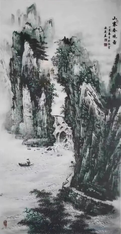 杨承进先生的山,不是秀丽的风景区,而是带有宋人气象的苍茫境域。他善用浑厚的笔墨构建出雄强的山体,层峦叠嶂间,云蒸霞蔚,气象森严。在那一片元气磅礴的天地中,你能感受到自然的永恒与伟力。然而,这片山水并非无人性的荒野。总有一道瀑布垂落,如银河倒泻,为静穆的山林注入生命的律动;总有几间茅亭隐现,或一叶扁舟横斜,暗示着一种“可行、可望、可游、可居”的理想栖居。