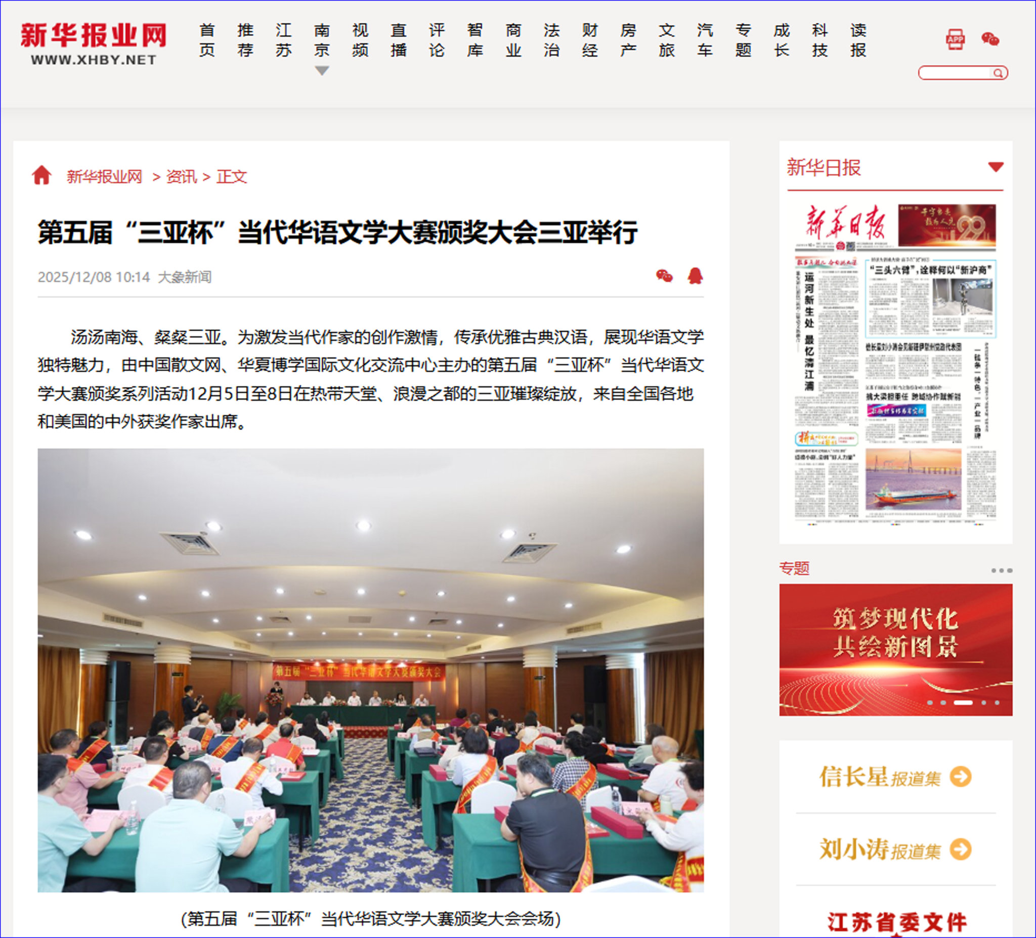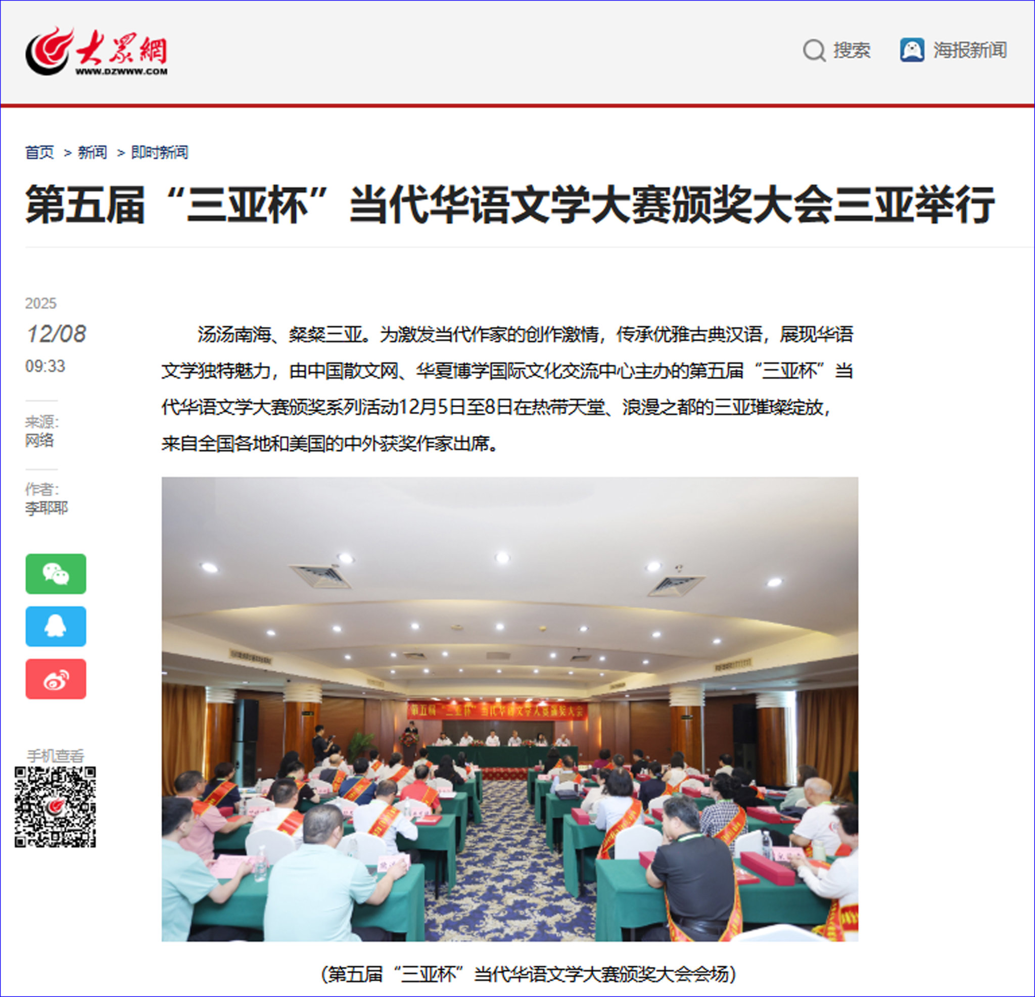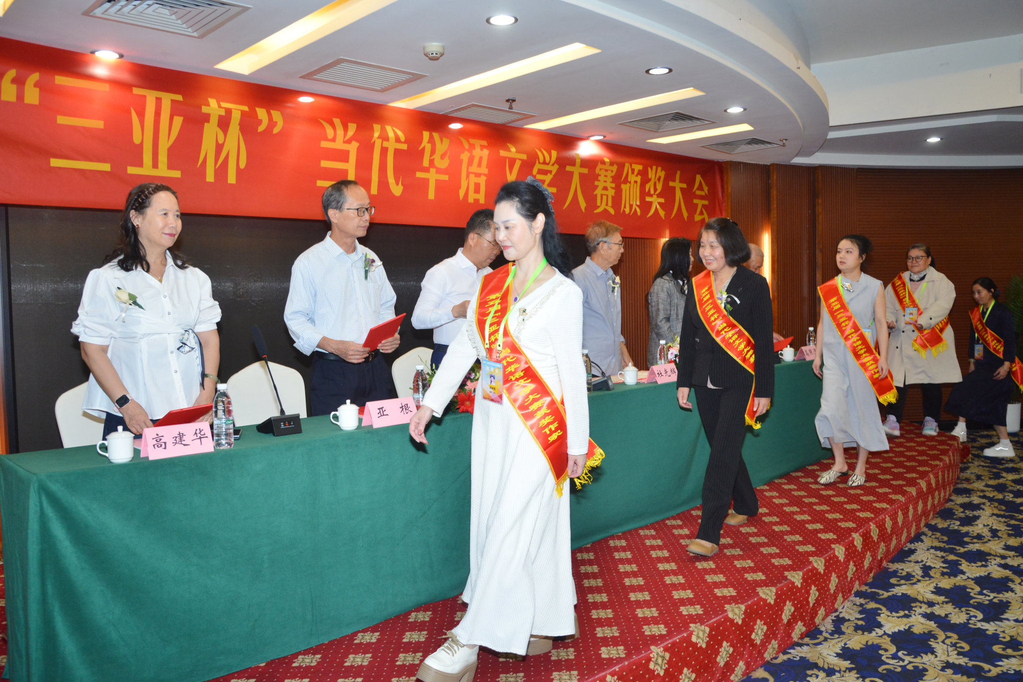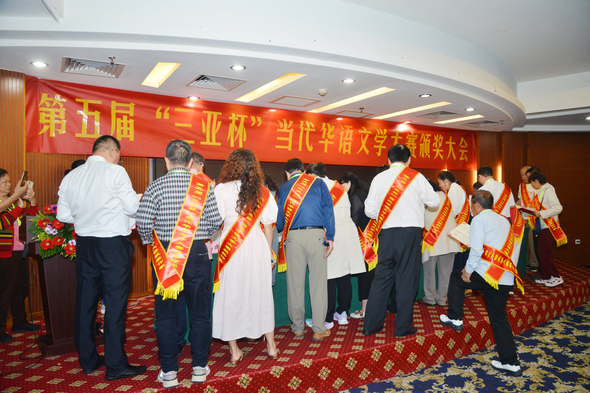 精华热点 中国散文网讯: 汤汤南海、粲粲三亚。为激发当代作家的创作激情,传承优雅古典汉语,展现华语文学独特魅力,由中国散文网、华夏博学国际文化交流中心主办的第五届“三亚杯”当代华语文学大赛颁奖系列活动12月5日至8日在热带天堂、浪漫之都的三亚璀璨绽放,来自全国各地和美国的中外获奖作家出席。
