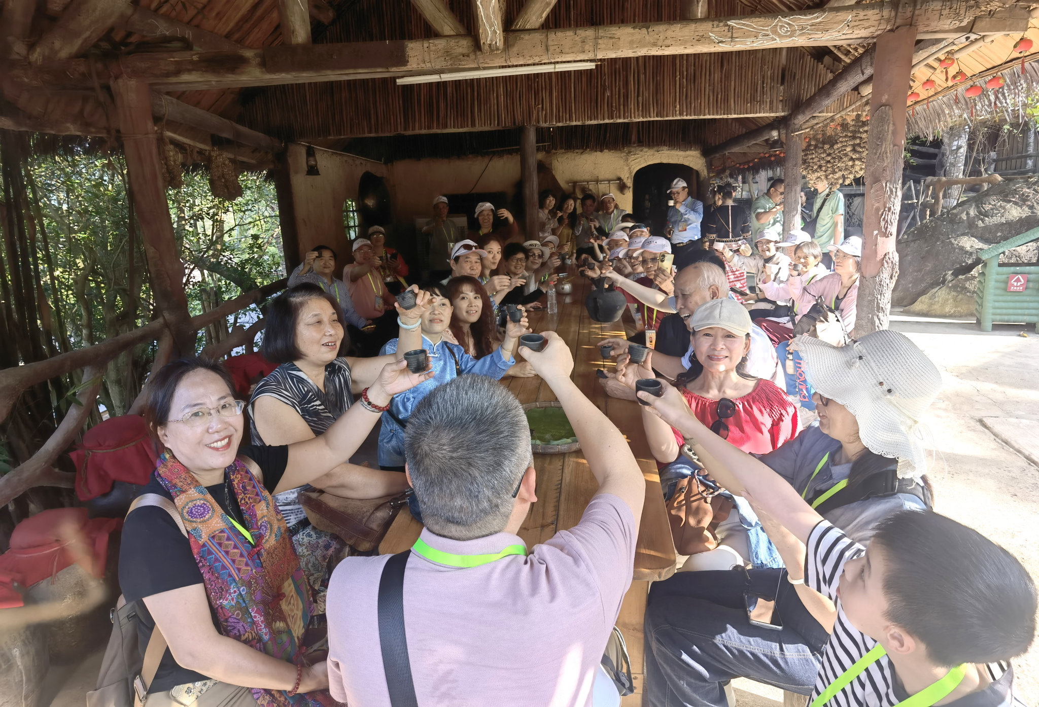 12月7日,组委会组织2025当代华语作家走进天涯海角、槟榔谷、黎苗村寨大型采风创作活动。作家们参观游览南天一柱、日月石、天涯石、海角石、天涯民族风情园、天涯画廊。后到槟榔谷的黎苗山栏文化馆、黎族文身馆、黎族原始陶艺馆、图腾艺术馆、黎族民俗馆、海南黎族传统织锦工艺美术品馆、棉纺馆、麻纺馆、无纺馆等十项国家级非物质文化遗产采风创作。并观赏琼剧,近距离了解海南民族音乐。晚上,当代华语作家品尝黎家五味什菜长桌宴,品尝最原汁原味的黎家美食,共饮黎家米酒。宴会后跳黎苗竹竿舞,与当地同胞相互挽臂,踩着节拍,尽情歌舞,体验激情四射的篝火晚会。