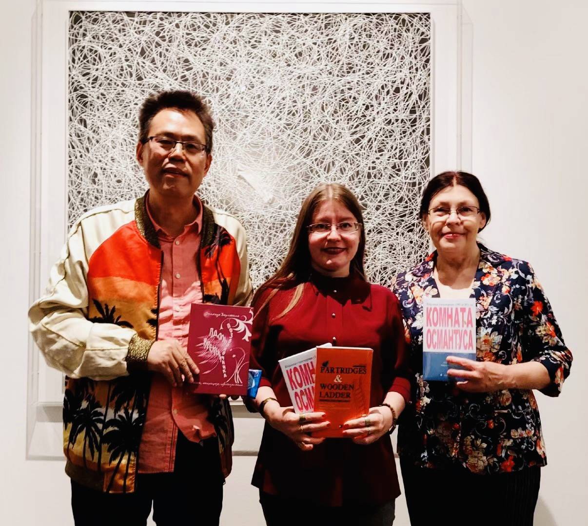 周瑟瑟(左一)与俄罗斯诗人季娜伊达·瓦尔利吉娜(左二)、俄罗斯文学艺术视频杂志《自由的词》艺术编辑塔季扬娜・瓦尔利吉娜(右一),在诗歌朗诵与交流活动现场。