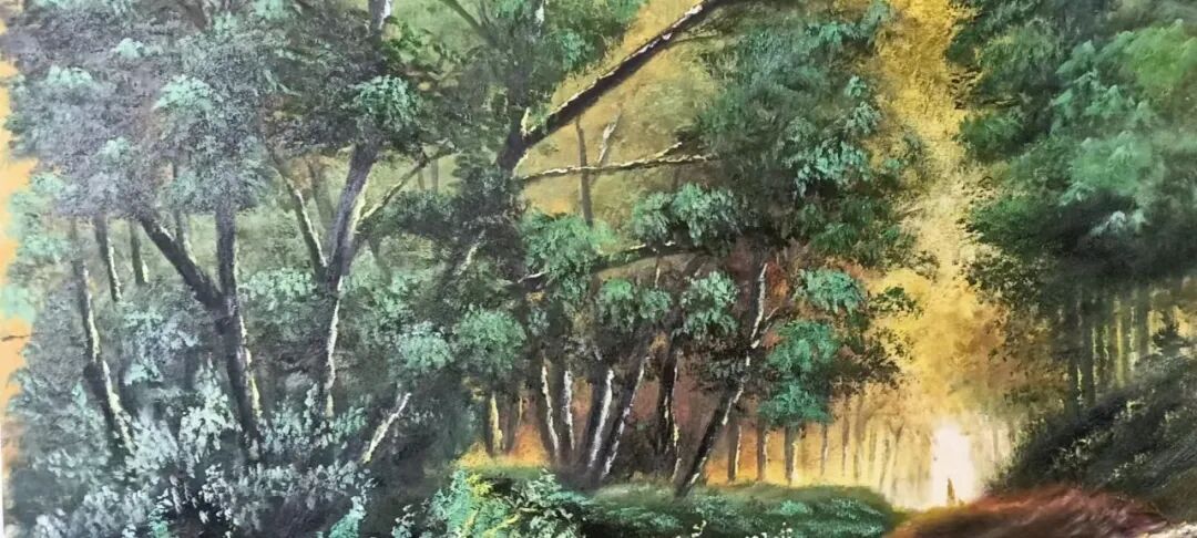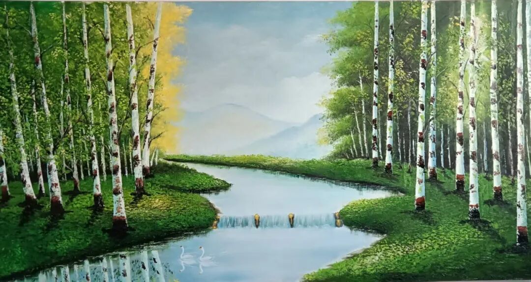 因为拥有超强的艺术探索意志,所以激发出天赋高能,让他的油画展现出工笔的精湛风格,也带有油画的技巧原质。他用中国画的意象塑造,为油画带来了别致唯美的新风格。你看,这亮丽的金黄和生机的青绿构建起的田野色,让画面极为生动活泼,绝无呆滞,静态的刻画,触发动态的意象,动人的美不仅显与外,也涵于内!毫无生硬,灵秀挥洒。村居林荫,皆如一酝陈酿,把欧洲文艺复兴的醇厚与宋元工笔的流韵勾兑在一起,让油画是油画的本质,同时居有了民族的特色。