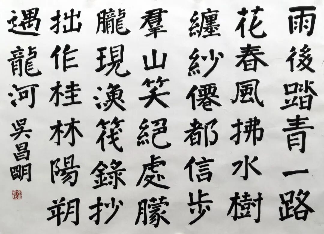 吴昌明,1955年生于桂林,系中国书法家协会会员、广西书法院院士、民革桂林书画院常务副院长、桂林市诗词楹联学会副会长、广西作家协会会员。曾任《漓江》杂志常务副主编、桂林市书法家协会副主席、桂林新诗社社长。