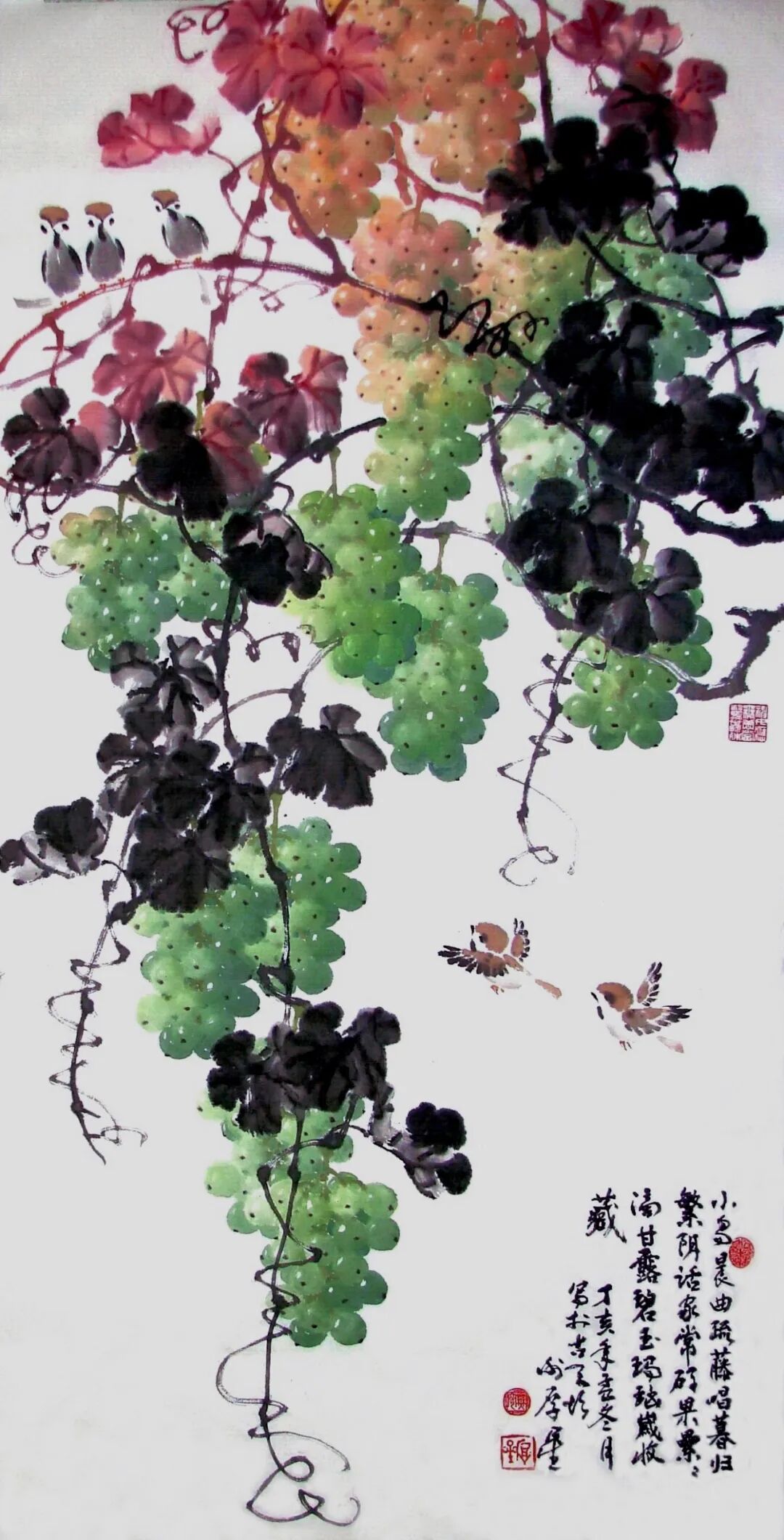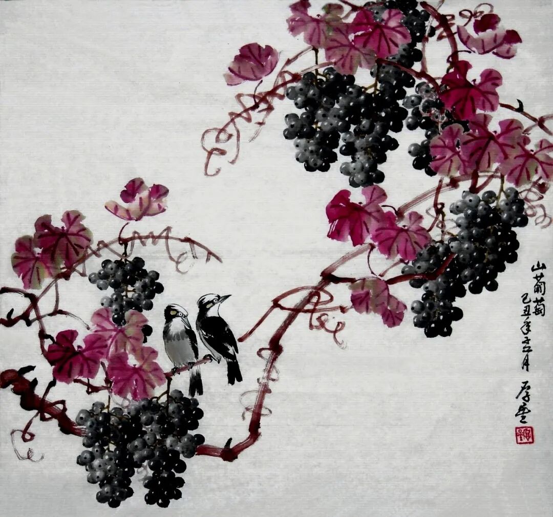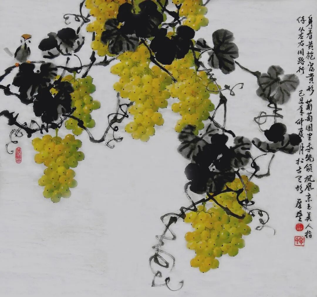 谈及谢厚星先生的中国画,令人赞叹的是花鸟作品的形式多样,尤其是葡萄系列已经成为当代审美的专有品牌。谢厚星先生的葡萄图用笔施骨法,色墨拟生态,让葡萄见证生命故事,展现出深厚的笔墨功夫,传达出可以刻骨铭心的思想品位。这些作品不仅是对自然物态的细腻描绘,更是对生活哲理的深刻思考,葡萄是画中晶珠象征着丰收的喜悦、生活的甘甜、岁月的沉淀……无穷的人格化内涵让人在欣赏之余可以无限遐想。