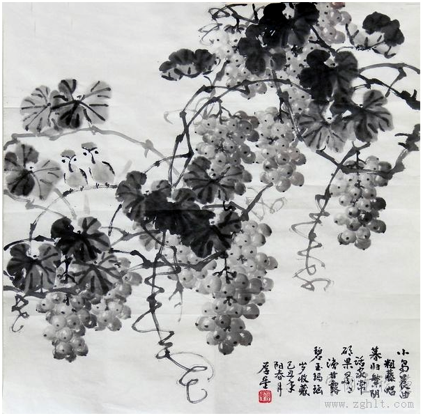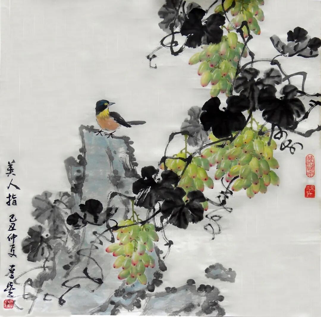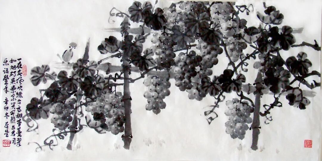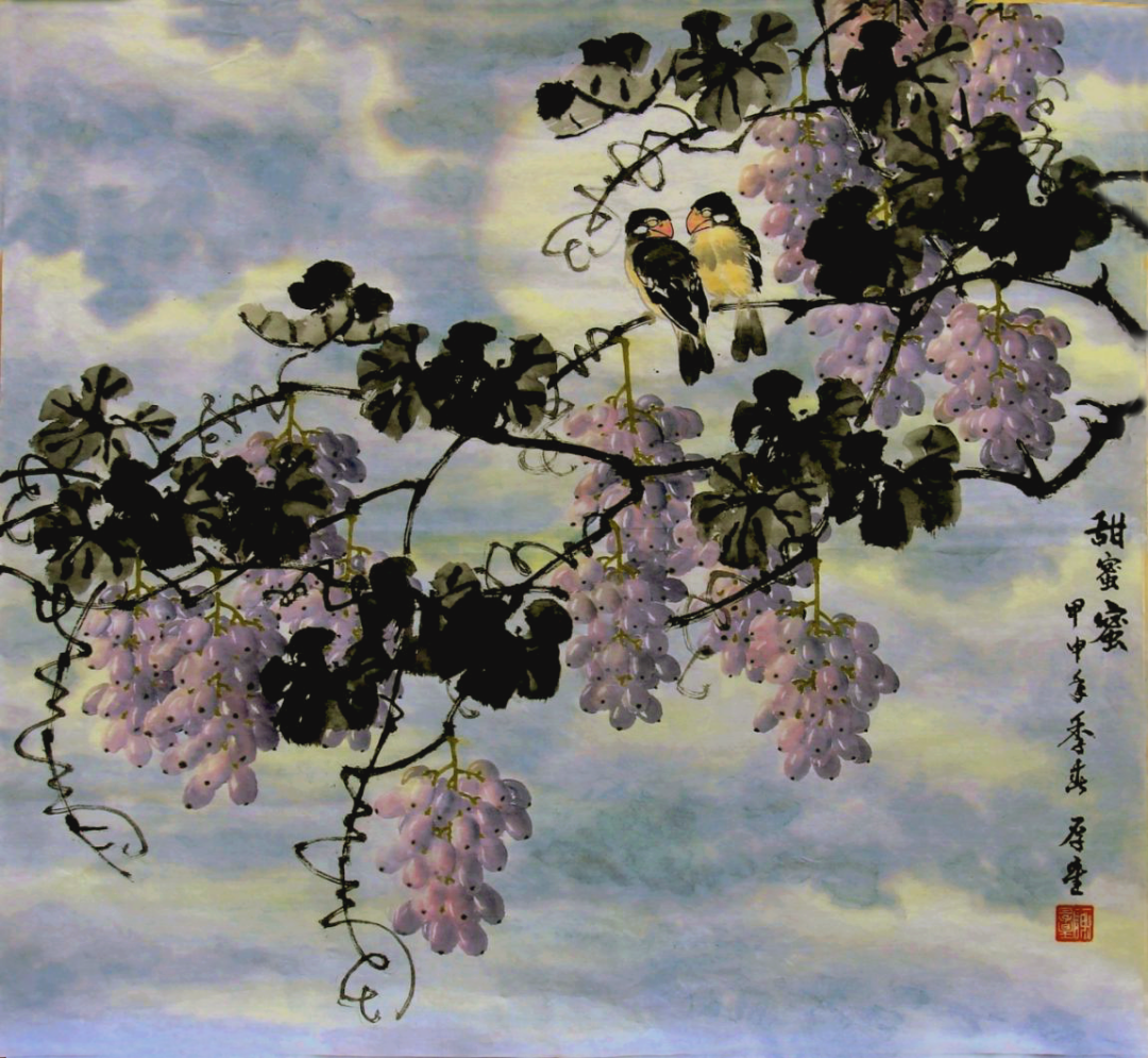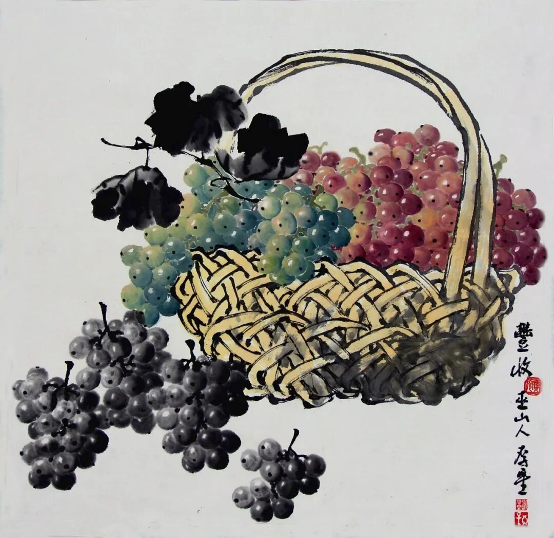 谈及谢厚星先生的中国画,令人赞叹的是花鸟作品的形式多样,尤其是葡萄系列已经成为当代审美的专有品牌。谢厚星先生的葡萄图用笔施骨法,色墨拟生态,让葡萄见证生命故事,展现出深厚的笔墨功夫,传达出可以刻骨铭心的思想品位。这些作品不仅是对自然物态的细腻描绘,更是对生活哲理的深刻思考,葡萄是画中晶珠象征着丰收的喜悦、生活的甘甜、岁月的沉淀……无穷的人格化内涵让人在欣赏之余可以无限遐想。