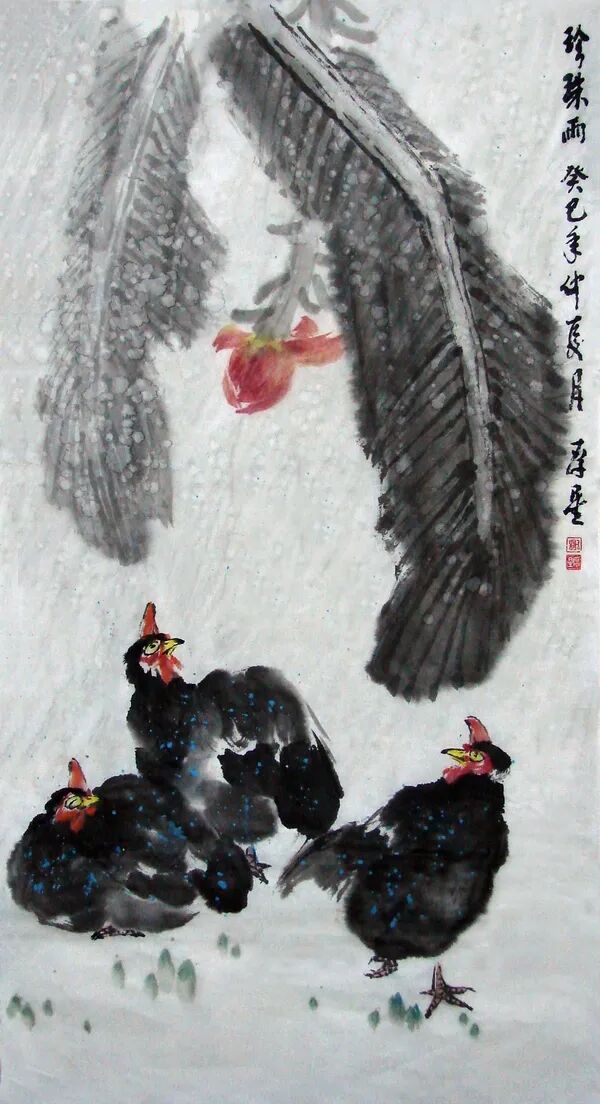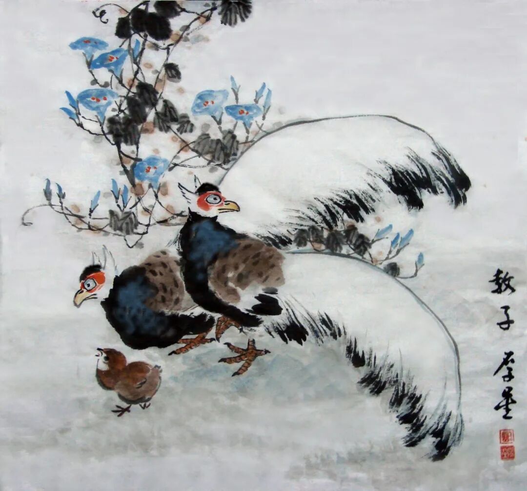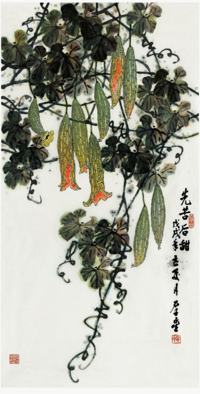谢厚星先生在绘画上的追求,远不止于形式的美感,他更加注重作品的意境与文化意旨的塑造。他的作品无论是花鸟还是人物,都不是画面的简单堆砌,而是精心构建的情景,蕴含着丰富的人生感悟和文化内涵。亲情的温馨如《教子图》,励志鼓舞如《凌霄花图》,对田园生活的赞美如《傲雪葡萄图》,人生哲理的探讨如《先苦后甜写意苦瓜图》,主题崇高打开了画以载道的一扇窗。透过作品可以看到画家的心灵世界,感受到对生活的热爱、对自然的崇敬以及对人性的洞察。让人赏心悦目,可以反复品读,果然是一些利益济人的神品佳作。